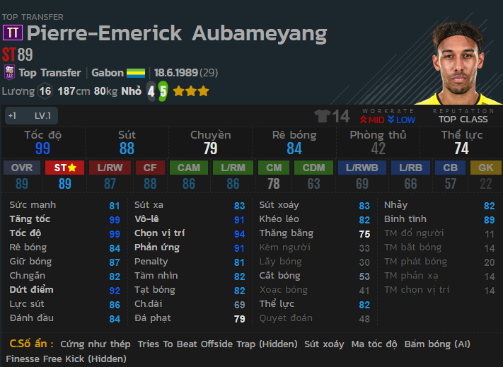 Auba sở hữu chỉ số dứt điểm không quá nổi trội nhưng trong game lại vô cùng hiệu quả trong các tình huống dứt điểm trong vòng cấm. Bóng đi tà tà rất khó bắt và có độ chính xác cao dù là một pha sút chéo góc hay một pha sút thẳng. Khả năng sút xoáy tầm trung của Auba cũng được đánh giá là khá tốt khi bóng có độ cong và có sự ổn định, ít khi vọt xà ra ngoài gôn. Tuy chỉ số đánh đầu và chỉ số nhảy không quá nổi trội nhưng với chiều cao khá lý tưởng, Auba thể hiện được sự hiệu quả trong các tình huống dứt điểm đầu trong những pha bóng tạt gần cũng như tạt xa. Tuy nhiên có một điểm thiếu ổn định chính là việc dứt điểm 1 chạm của Auba. Bóng đôi lúc đi lệch với hướng mong muốn và có lực nhẹ, dễ bị cản phá.