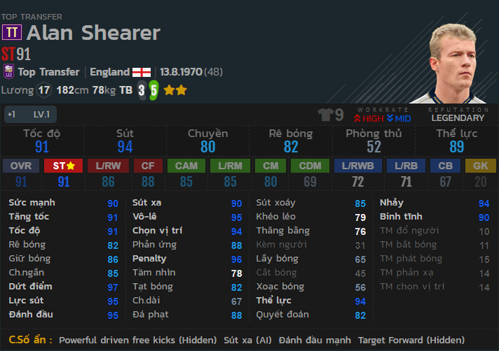 Một trong những chân sút cực kì bá đạo của tuyển Anh một thời, Shearer cho thấy khả năng sút miễn bàn trong game khi lực bóng là rất mạnh và có độ chính xác cực kì cao. Cho dù là sút chéo góc sút thẳng hay thậm chí là dứt điểm 1 chạm, bóng luôn tìm đến đúng địa điểm và khiến những pha bay người hay cản phá của thủ môn trở nên thừa thãi. Khả năng không chiến của Shearer là rất tốt dù chỉ cao 1m82 nhưng với thể hình đầm, khả năng chọn vị trí, nhảy cũng như tì đè với hậu vệ để có được tư thế đánh đầu thuận lợi là rất tốt. Bóng đi mạnh và khó bắt. Một khả năng khác mà ít ai ngờ tới chính là khả năng sút xoáy tầm trung của Shearer là khá ảo, bóng không quá cong nhưng lực lại rất mạnh và khó bắt.