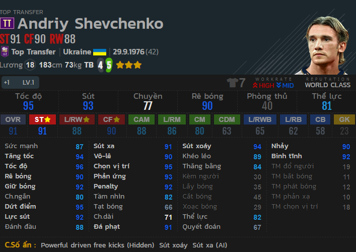 Linh dương đông âu ở phiên bản này có khả năng dứt điểm ở rất nhiều tư thế, bóng đi mạnh và cực kì khó bắt. Khả năng sút chéo góc, sút thẳng hay thậm chí dứt điểm 1 chạm Sheva đều thể hiện một cách vô cùng xuất sắc. Những cú cứa lòng tầm trung và tầm xa của Sheva cực kì khó chịu. Bóng đi rất cong nhưng lại có điểm đích đến cực kì chính xác khi thường xuyên đi vào góc chết nơi khung thành. Đánh đầu cũng là điểm đáng chú ý của Sheva dù lực đánh đầu không mạnh nhưng lại có hướng đi khá hiểm và độ chuẩn xác cao.