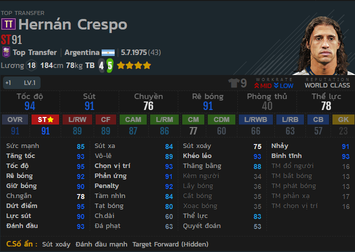 Với khả năng sút cực tốt cả 2 chân cho dù 1 chân không thuận chỉ có 4 điểm, Crespo thực sự là sát thủ nơi vòng cấm khi sút chéo góc ở cả 2 bên trái phải đều rất hay. Bóng đi rất căng và khó cản phá đối với thủ môn đối phương. Khả năng cứa lòng phạm vi gần lẫn tầm trung ngoài vòng cấm của Crespo là rất tốt, bóng đi cong, lực mạnh và rất khó bắt. Khả năng đánh đầu của Crespo cũng rất tốt với thể hình tương đối chắc chắn và khả năng bật nhảy tốt, cùng với đó là lực đánh đầu rất mạnh và khả năng điều bóng là vô cùng chính xác. Khả năng dứt điểm 1 chạm của cầu thủ này cũng là rất tốt.