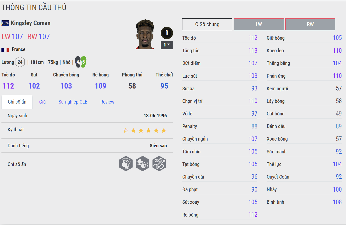 Coman được nâng cấp chân không thuận cùng bộ chỉ số cực kì phù hợp với nhu cầu chạy cánh ở meta hiện tại. Tiền đạo đội tuyển Pháp hiện đang được nhiều game thủ Hàn đánh giá cao về những nâng cấp về bộ kỹ năng, khả năng bứt tốc tốt và hiệu quả, kỹ năng chuyền bóng, tạt bóng được cải thiện.