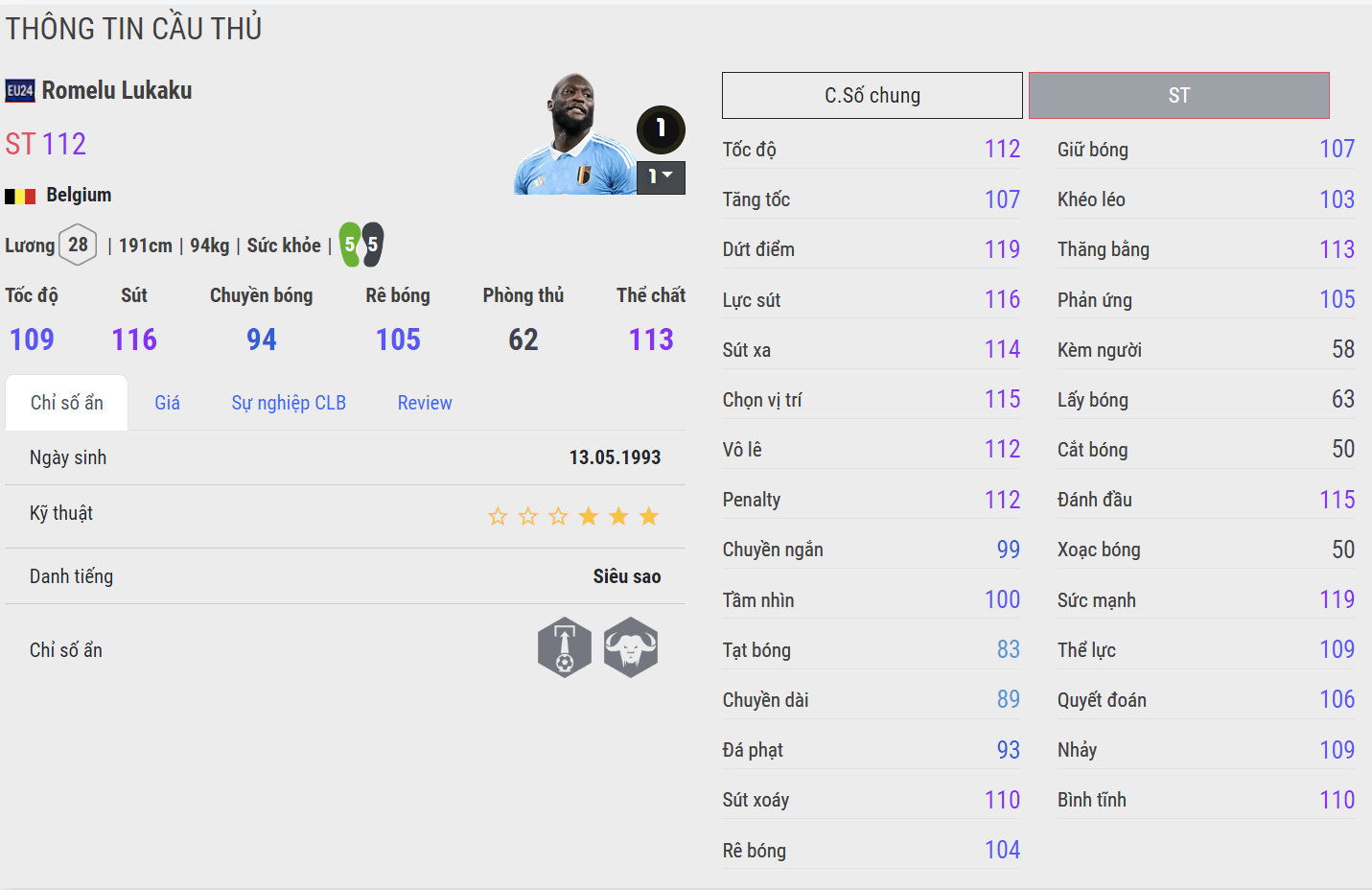 Lukaku cũng có lần đầu tiên được lên 2 chân 5 sao, sở hữu thể hình tốt,kỹ năng sút ổn, thể hình to cao, tì đè hiệu quả. Cầu thủ người Bỉ vẫn được xem là một trong những tiền đạo hàng đầu của giải đấu và có tiềm năng tăng chỉ số rất lớn.