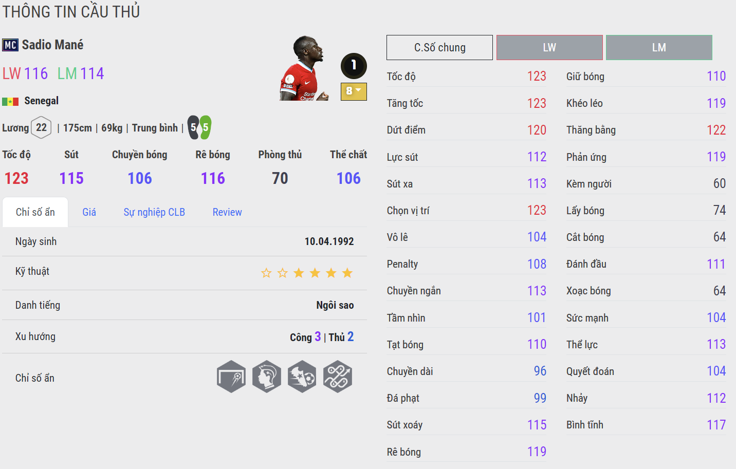Sadio Mane MC vẫn luôn được đánh giá là chân chạy cánh cực rẻ mà hiệu quả nổi bật của Liverpool cũng như Bayern Munich. Sở hữu tốc độ tốt, bộ kỹ năng ghi bàn ấn tượng cùng khả năng di chuyển nhận bóng cực kì thông minh. Không chỉ có vậy, khả năng chuyền tạt, rê dắt cũng như tì đè của tiền đạo người Senegal cũng đem lại giá trị nổi bật.
