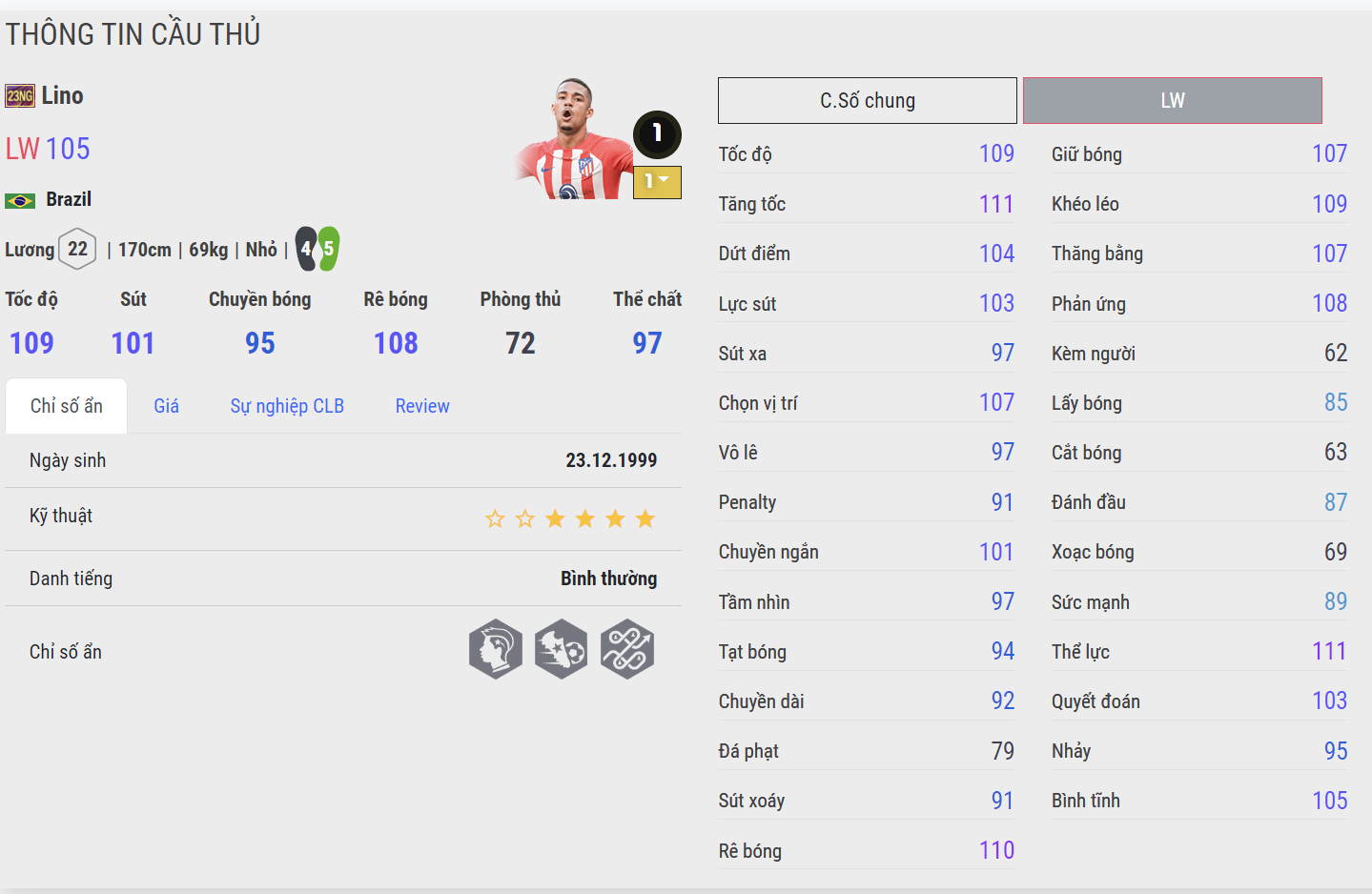 Cầu thủ chạy cánh của Atletico được đánh giá rất cao với bộ chỉ số thiên về vị trí chạy cánh có tốc độ và kỹ thuật cao. Điểm mạnh của Lino nằm ở tốc độ, khả năng tăng tốc vượt trội cùng kỹ năng rê dắt xử lý bóng khéo léo rất tốt.