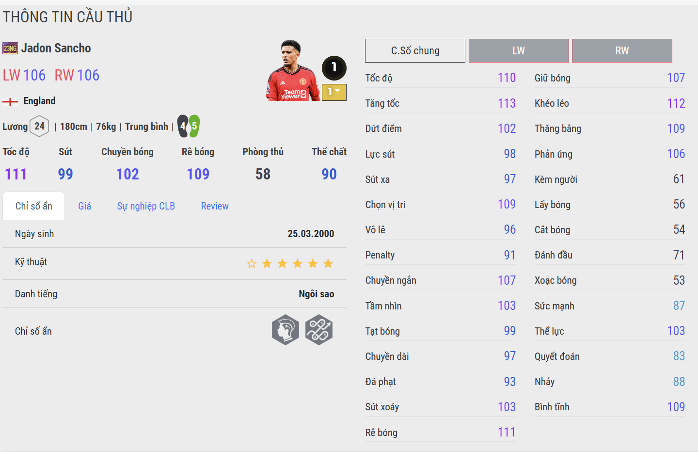 Hơi bất ngờ khi Sancho có mùa thẻ 23NG khi cầu thủ người Anh vốn đã rất nổi bật cũng như tỏa sáng từ giai đoạn 2019 - 2020 trong màu áo Dortmund với tư cách là một trong những tài năng trẻ được săn đón bậc nhất châu Âu. Ở mùa thẻ này, điểm mạnh tốc độ và rê dắt bóng của Sancho vẫn được giữ nguyên, tuy nhiên cầu thủ của Man Utd lại hơi kém ở khâu dứt điểm và chuyền bóng.