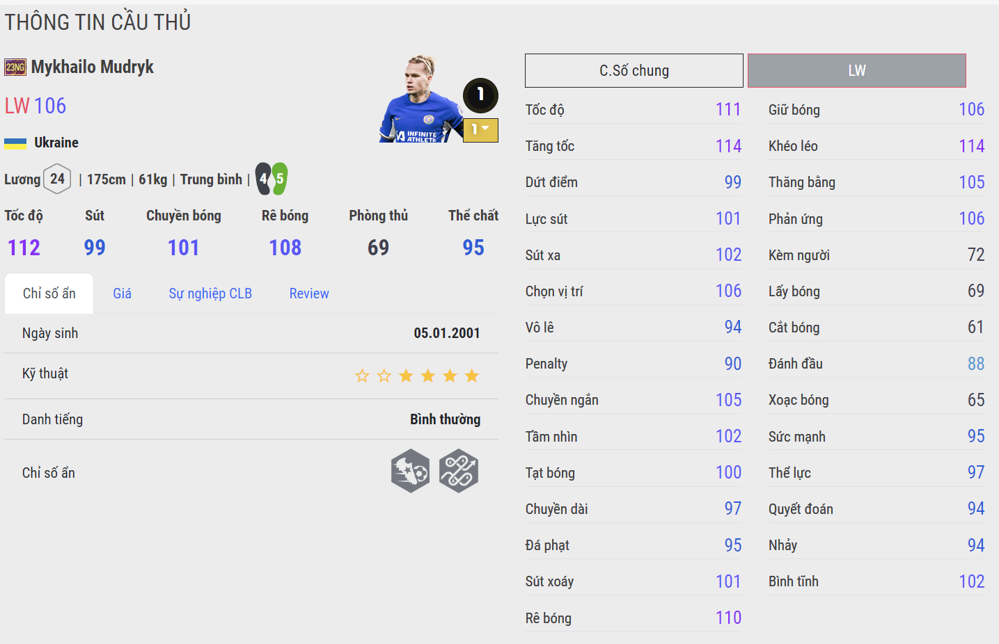 Trở thành tân binh của Chelsea với mức giá khủng, Mudryk được đánh giá là cầu thủ chạy cánh có tốc độ nhanh top đầu của mùa thẻ 23NG. Khả năng rê dắt xử lý bóng của Mudryk cũng là rất tốt. Ngoài ra cầu thủ người Ukraine cũng cho thấy kỹ năng dứt điểm và chuyển bóng ở mức tốt, ổn định và hiệu quả.