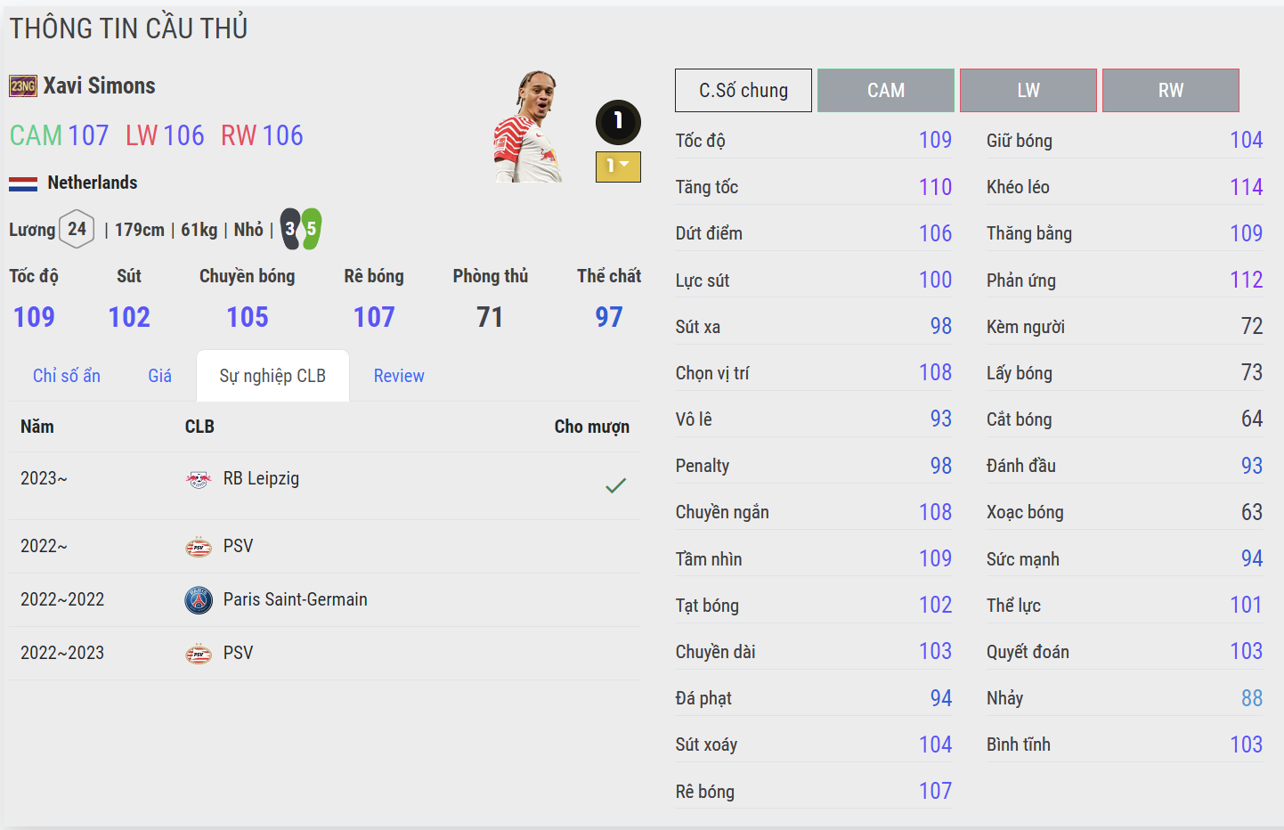 Tài năng trẻ của bóng đá Hà Lan đang được coi là làn gió mới cho vị trí chạy cánh. Tốc độ tốt, khả năng chuyền bóng, rê dắt, xử lý bóng đều rất ổn cùng với đó là khả năng dứt điểm cũng cho thấy rõ sự hiệu quả. Simons nhiều khả năng sẽ là cái tên được săn đón rất nhiều cho những ai chơi team color PSG, Leipzig hay ĐT Hà Lan.