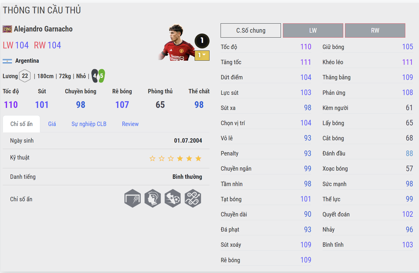 Tài năng trẻ của Man Utd có bộ chỉ số cũng như chỉ số ẩn rất ổn cho vị trí chạy cánh. Từ tốc độ, khả năng xử lý bóng kỹ thuật cho đến khả năng ZD được đánh giá là rất ổn trong tầm giá. Không những thế, việc thi đấu tỏa sáng ngoài đời cũng một dàn fan hùng hậu, Garnacho hứa hẹn sẽ là cái tên được quan tâm bậc nhất trong thời gian tới.