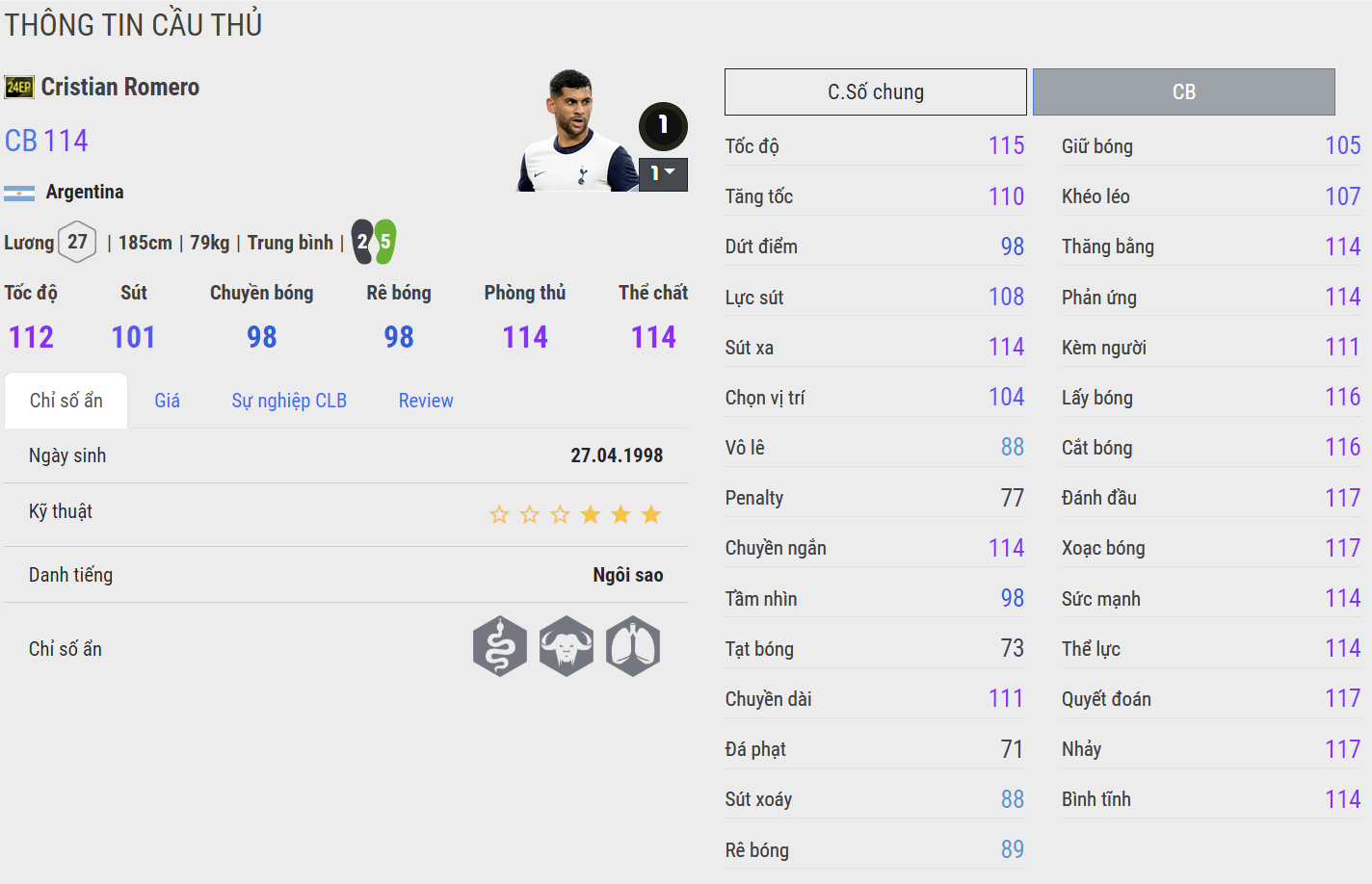 Romero đang được đánh giá là mẫu trung vệ khá hiệu quả và đem lại giá trị sử dụng cao. Sở hữu thể hình ổn, tốc độ nhanh cùng AI cắt bóng khá khôn giúp anh trở thành cái tên chủ lực cho những team color như Tottenham, Juventus, Argentina. Đặc biệt là với chỉ số ẩn Nỗ lực đến cùng sẽ giúp anh có thể duy trì thể trạng cực kì tốt ở giai đoạn cuối trận đấu.