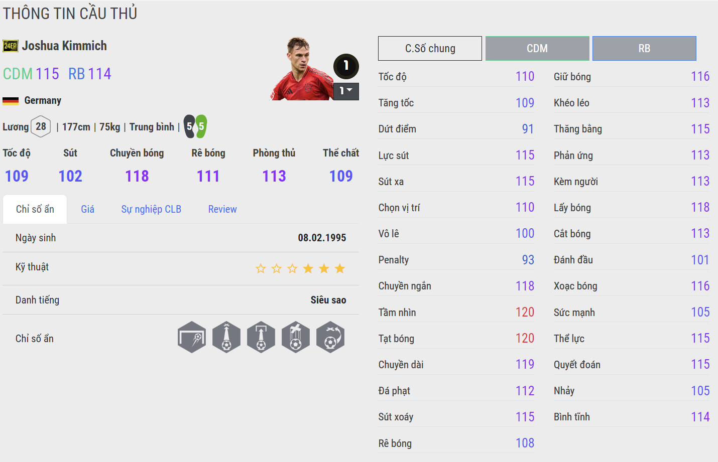 Kimmich vốn là một trong những tiền vệ quốc dân hàng đầu giành cho Bayern cũng như ĐT Đức. Với phiên bản 24EP, Kimmich tiếp tục có cho mình những nâng cấp đáng giá về bộ chỉ số từ khả năng chuyền bóng, hỗ trợ phòng ngự cho đến tham gia tấn công và sút xa đều cho thấy rất nhiều hiệu quả.