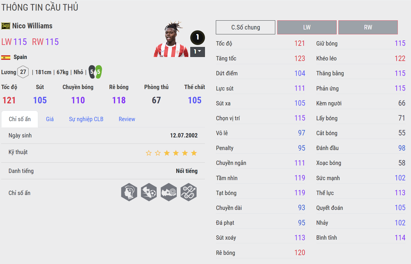 Nổi bật sau mùa Euro 2024 thành công cùng Tây Ban Nha, Williams giờ đây đang là cái tên được rất nhiều đội bóng quan tâm ngoài đời. Sở hữu 2 chân 5 sao, kỹ năng rê dắt bóng cực dẻo cùng khả năng chuyền bóng cũng rất tốt, tiền đạo cánh người TBN hiện đang là cái tên đáng dùng cho các HLV ưa thích mẫu cánh vừa có tốc độ vừa có kỹ thuật tốt.