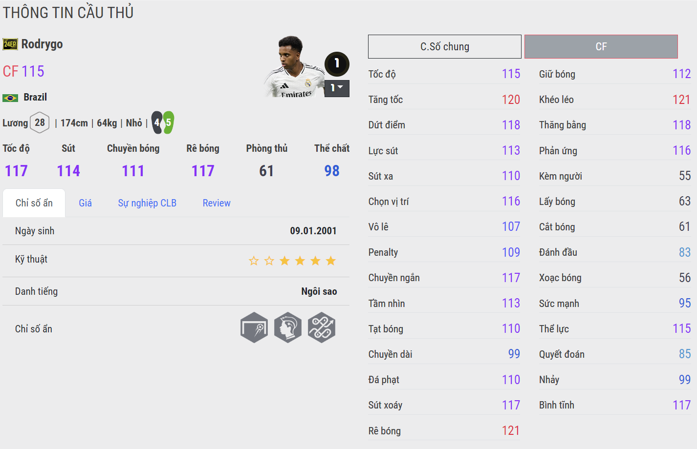 Rodrygo luôn là sự lựa chọn ưu tiên hàng đầu ở hành lang cánh phải đương đại cho team color Real Madrid và phiên bản 24EP tiếp tục là một phiên bản nâng cấp chất lượng của Rodrygo so với các mùa thẻ trước. Từ tốc độ, dứt điểm, kỹ năng chuyền bóng rê bóng của Rodry đều cho thấy hiệu quả ấn tượng.