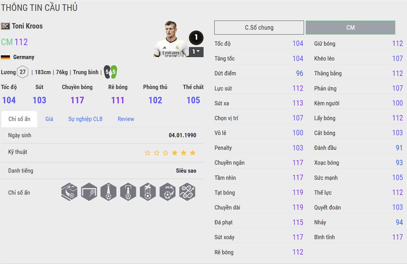 Kroos DC được đánh giá về mức độ toàn diện cao bởi cải thiện về kỹ năng phòng ngự và thể chất. Kroos tranh chấp bóng ổn định hơn, khả năng tì đè, tham gia phòng ngự rất hiệu quả cùng thể lực tốt. Không chỉ phòng ngự, Kroos vẫn luôn được biết đến là tiền vệ trung tâm sút xa cực hay của FC Online, ngoài ra khả năng chuyền bóng xuất sắc cùng AI thông minh giúp Kroos đang được tin dùng rất nhiều ở mùa thẻ DC hiện tại.
