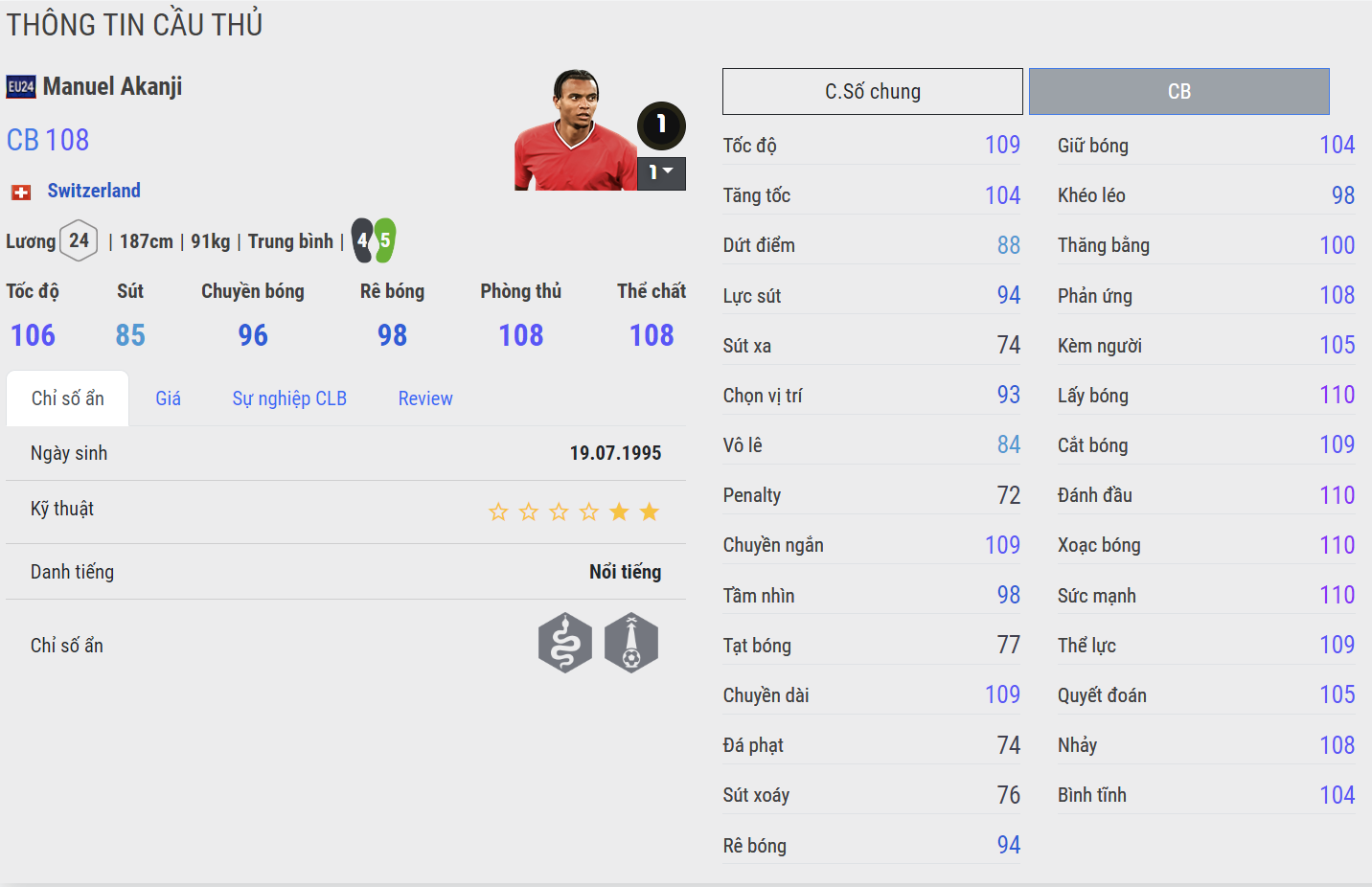 Akanji nổi bật với hai màu áo Man City và Dortmund, sở hữu bộ chỉ số phòng ngự ấn tượng, với thể hình cao ráo, tốc độ ổn định và kỹ năng không chiến đáng kể. Tuy nhiên, khả năng tì đè của anh vẫn còn phải cải thiện.