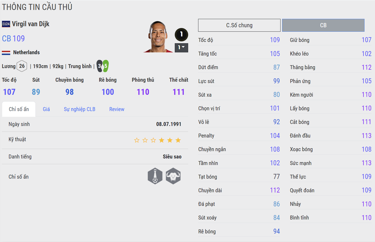 Van Dijk, cầu thủ của Liverpool, vẫn là một biểu tượng trong hàng phòng ngự. Anh sở hữu thể hình và sức mạnh vượt trội, với khả năng tì đè không ai sánh kịp. Sải chân dài giúp anh tắc bóng thuận lợi, và kỹ năng chọc lấy bóng và xoạc bóng của anh đều rất hiệu quả.