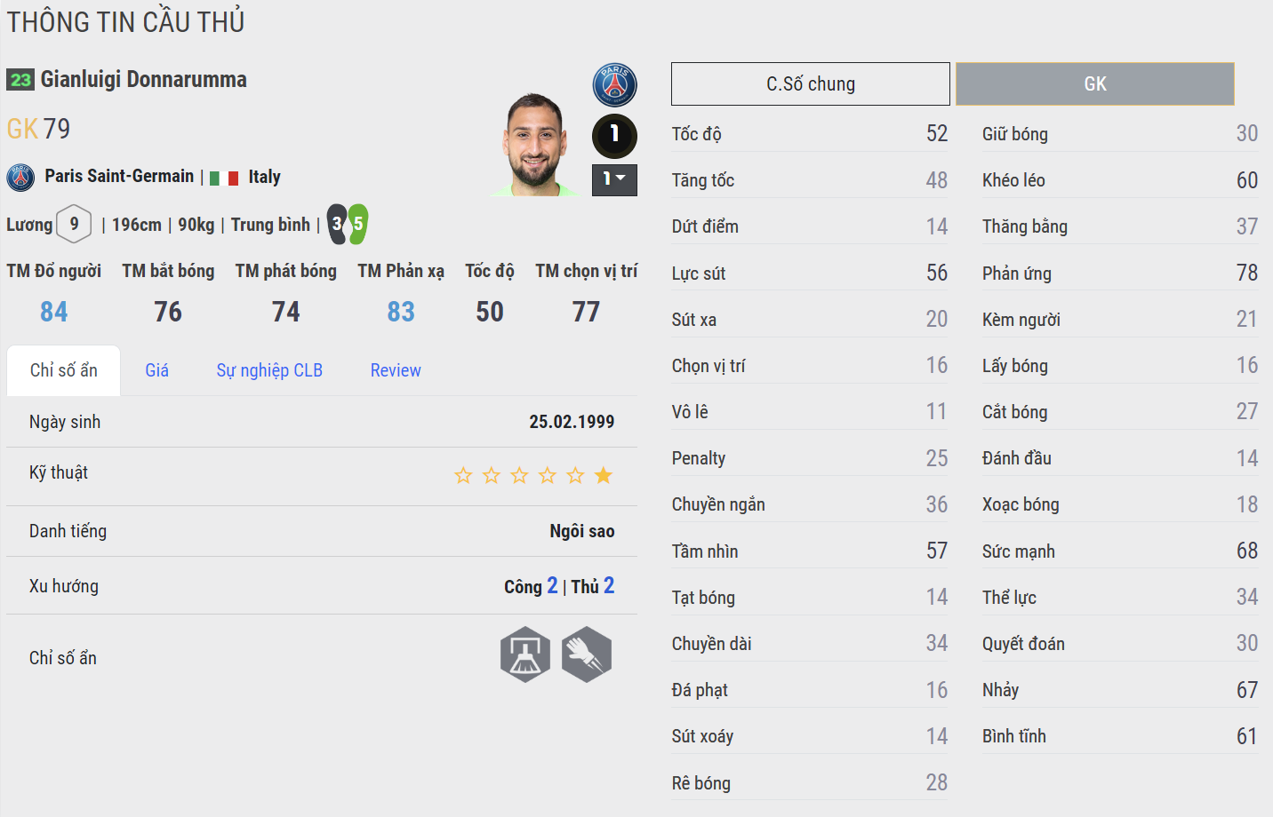 Donnarumma được xem là cái tên cực kì uy tín trong khung gỗ. Sở hữu chiều cao và sải tay lý tưởng, Donnarumma cho thấy được sự hiệu quả trong các tình huống cản phá trước khung thành. Donnarumma có khả năng bật và đổ người cực nhanh để truy cản những pha sút xa, ZD hoặc những pha sút trực diện. Sở hữu team color AC Milan, PSG và Ý, đây đều là những team color mạnh và đáng dùng.