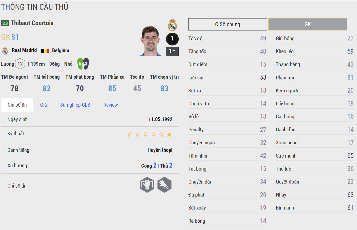 Được xem là thủ môn hay nhất game, Courtois mùa Live cho thấy rõ hiệu quả và đôi khi là cả sự khó chịu cho nhiều HLV khi phải bắn phá một khung thành mà trước mặt là Courtois. Sải tay dài , phản xạ tốt, cản phá hay và AI khá khôn giúp cho Courtois được tin dùng bậc nhất. Không những vậy, Courtois còn sở hữu những team color chất lượng như Real Madrid, Chelsea, Atletico Madrid hay ĐT Bỉ.