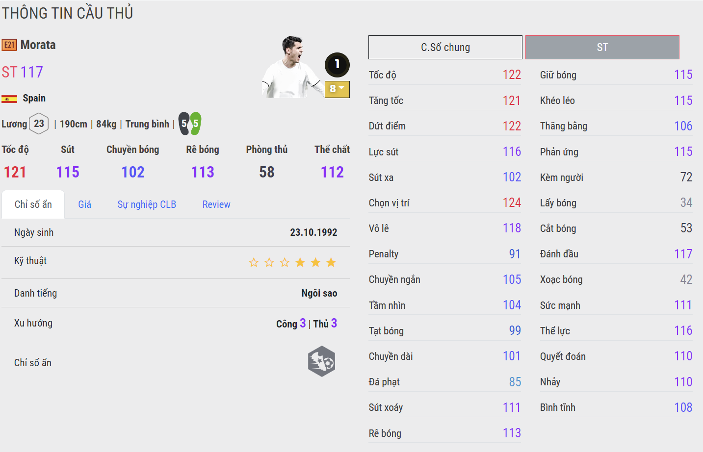 Tiền đạo người TBN là cái tên góp mặt trong danh sách này. Sở hữu nhiều team color chất lượng, Morata còn cho thấy giá trị sử dụng cực cao ở vai trò tiền đạo khi anh có thể hình tốt, tốc độ nhanh cùng kỹ năng dứt điểm hiệu quả bằng cả 2 chân. Khả năng di chuyển, chọn vị trí nhận bóng của Morata là rất khôn, kỹ năng không chiến của Morata cũng cực kì hiệu quả. Hiệu suất ghi bàn của Morata E21 là cực kì cao, tuy nhiên khả năng sút xa của Morata không thực sự ấn tượng.