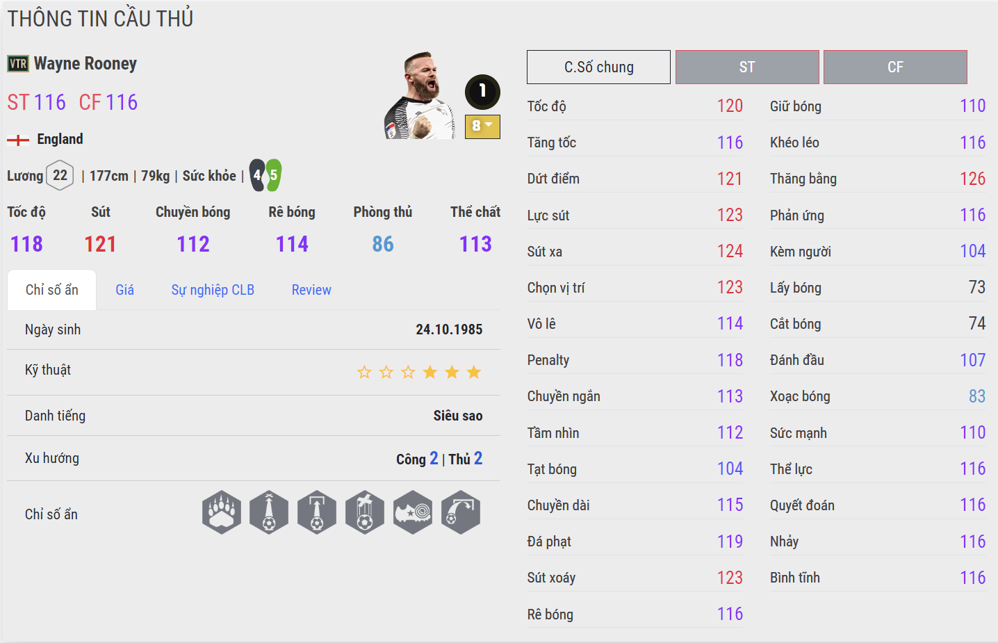 Rooney được xem là cái tên hàng đầu cho vị trí tiền đạo cắm thời điểm hiện tại. Tiền đạo người Anh có thể hình đầm chắc, tốc độ tốt, sức tì đè rất khỏe khi so vai trực tiếp với các cầu thủ đối phương. Khả năng dứt điểm của Rooney là cực kì tốt với lực sút rất căng, độ chính xác cao cả trong lẫn ngoài vòng cấm. Khả năng sút xa lẫn ZD của Rooney là cực kì hiệu quả, không những vậy AI di chuyển thông minh khiến cho Rooney luôn biết cách tận dụng khoảng trống để ghi bàn hoặc hút người nhằm tạo lợi thế cho các đồng đội.