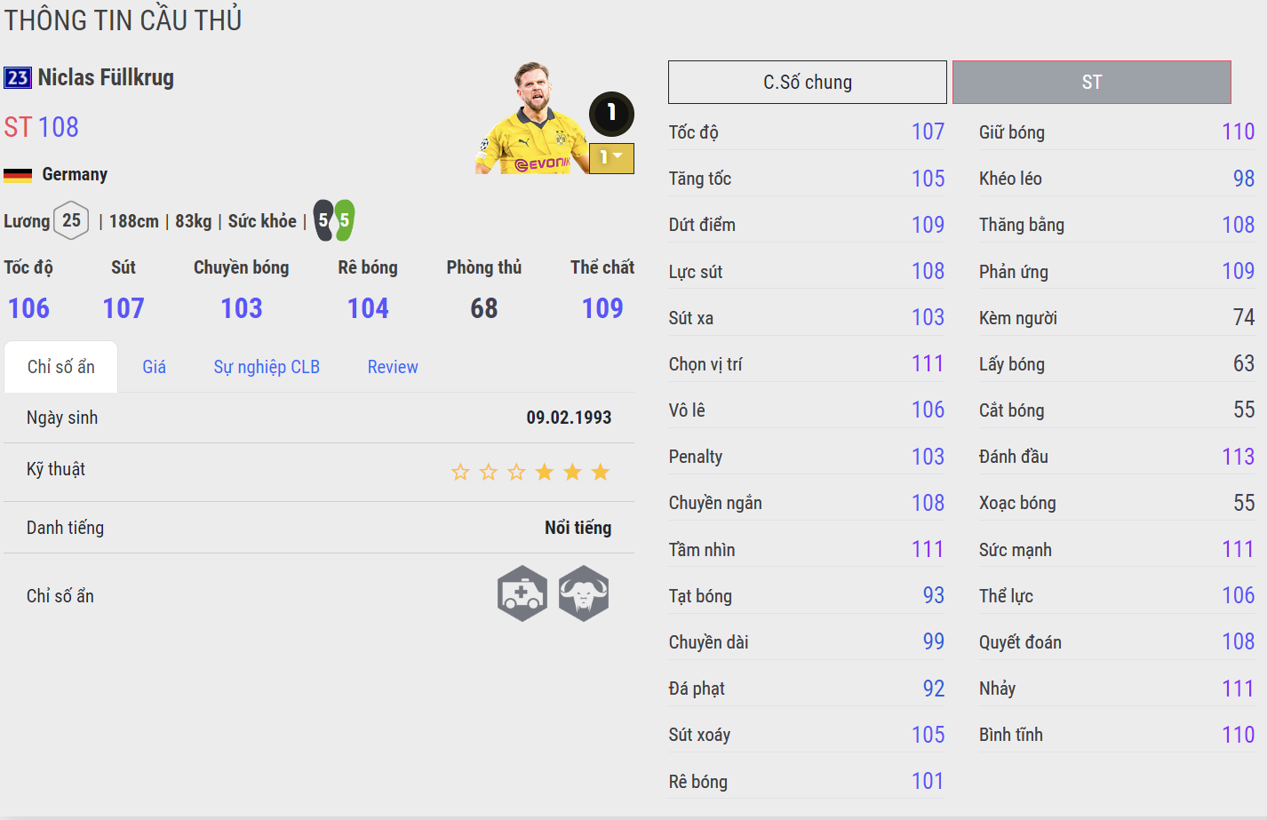 Tiền đạo của Dortmund đang thăng tiến mạnh mẽ và dần trở thành cái tên tiền đạo được nhiều game thủ quan tâm. Fullkrug sở hữu thể hình to cao, 2 chân 5-5 cùng bộ kỹ năng dứt điểm đa dạng từ sút cận thành, sút xa cho đến không chiến. Đây hứa hẹn là một trong những tiền đạo được quan tâm hàng đầu trong thời gian tới.