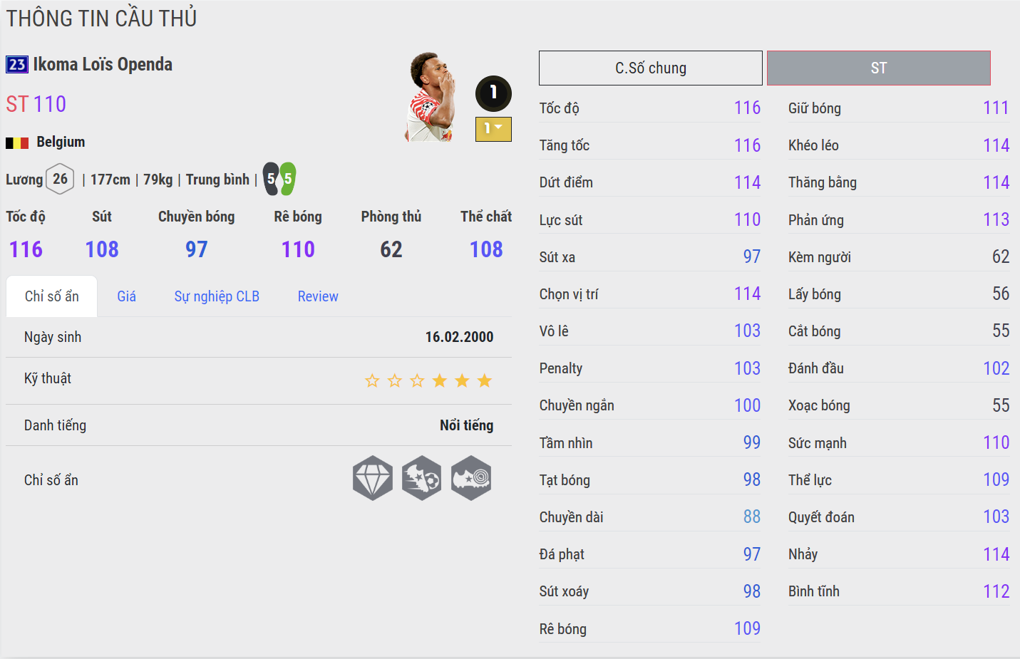 Với việc thể hiện rất tốt trong những màu giải gần đây, Openda đang cho thấy giá trị của mình cả ngoài đời lẫn trong game. Tốc độ xé gió, khả năng dứt điểm nhạy bén cùng lực sút căng và hiểm. Bộ chỉ số thiên về lối chơi tốc độ nhưng vẫn có thể tham gia vào các tình huống không chiến khi cần. Openda thực sự là một cái tên chất lượng cho hàng công lúc này.