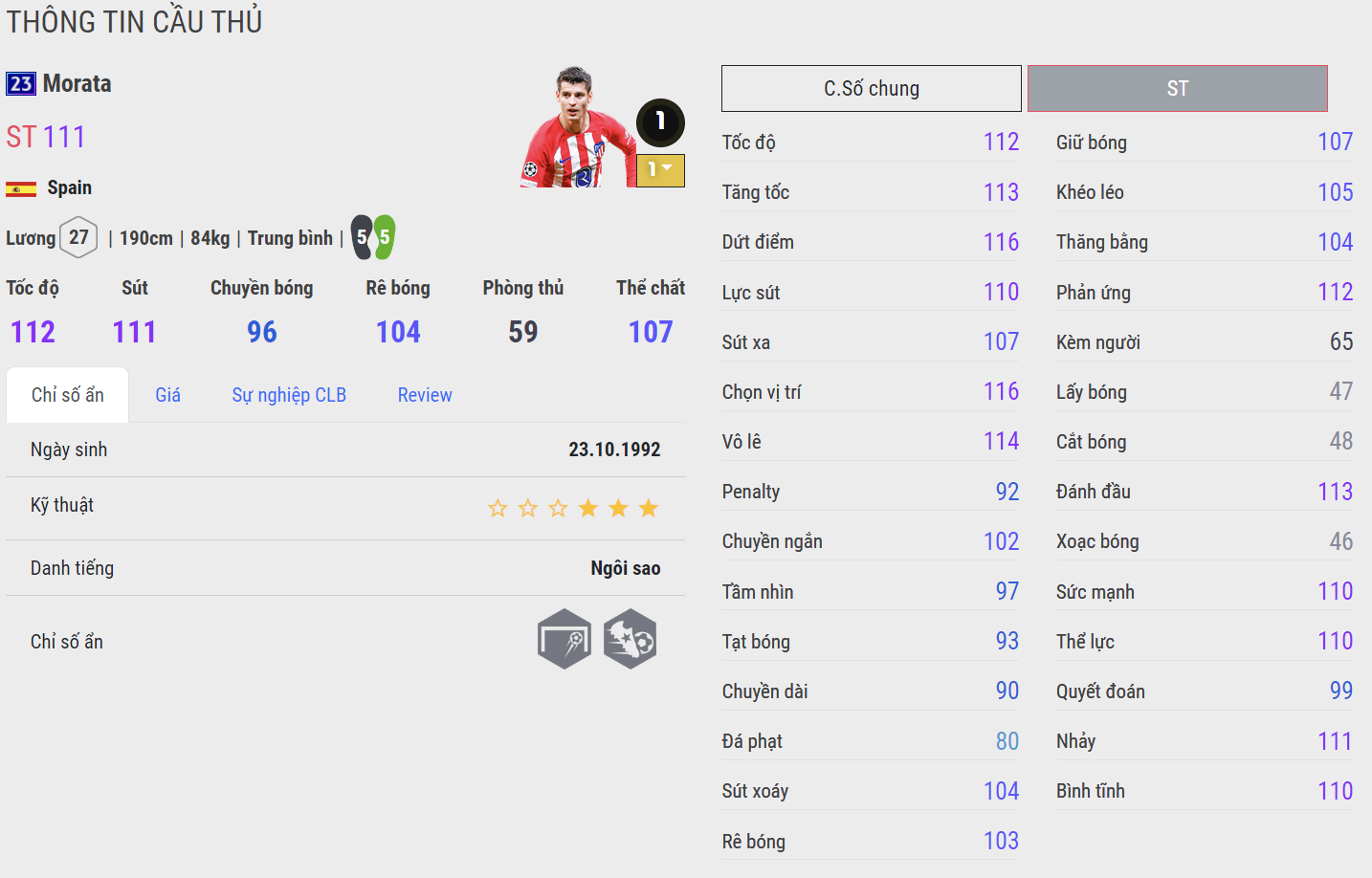 Morata đang có phong độ ấn tượng thời gian gần đây trong màu áo Atletico. Đó là lí do khiến cho chỉ số của cầu thủ người TBN rất nổi bật ở mùa thẻ 23UCL. Từ tốc độ, kỹ năng dứt điểm tốt bằng 2 chân, khả năng sút xa lẫn không chiến tốt cùng một AI di chuyển khá thông minh. Morata đích thị là một trong những cái tên đáng dùng cho vị trí tiền đạo mùa thẻ mới.