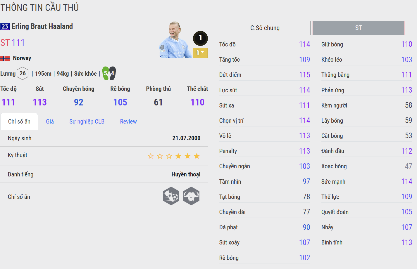 Haaland là một trong những tiền đạo hàng đầu thời điểm hiện tại. Thể hình to khỏe, khả năng càn lướt tốt cùng kỹ năng dứt điểm hiệu quả ở nhiều góc độ khác nhau khiến tiền đạo người Na Uy được đánh giá rất cao về giá trị sử dụng. Điểm nổi bật của mùa thẻ 23UCL là AI được nâng cấp lên huyền thoại. Một AI cực khôn bổ trợ nhiều trong các tình huống di chuyển tách người thông minh của các cầu thủ.