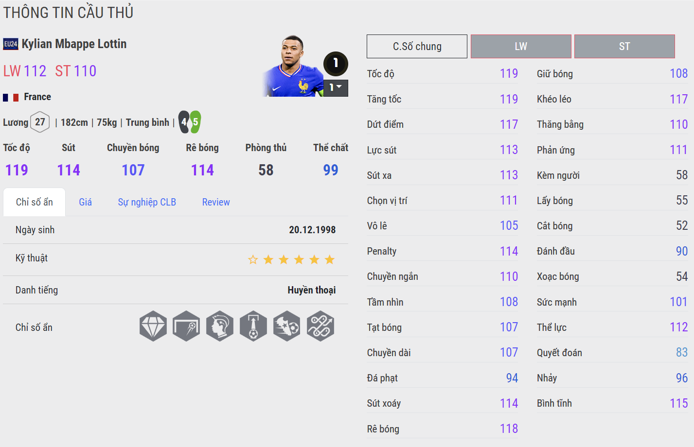 Mbappe hiện đang được đánh giá rất cao ở hành lang trái. Khả năng bứt tốc nhanh nhẹn và gần như là tốt nhất ở mùa EU24, kỹ năng rê bóng tốt, khả năng dứt điểm hiệu quả từ sút gần, sút xa cho đến ZD. Mbappe tì đè mạnh mẽ và kỹ năng chuyền bóng của anh mùa EU24 cũng đã được cải thiện đáng kể.