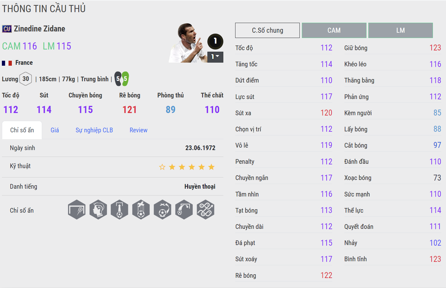 Huyền thoại người Pháp đang là cái tên được đánh giá cực uy tín ở không chỉ mùa thẻ CU mà còn là vị trí chung các mùa thẻ cho vai trò CAM. Sở hữu bộ kỹ năng chuyền sút và rê dắt đều ấn tượng và gần như hoàn hảo ở vai trò tấn công, Zidane còn cho thấy tốc độ nhanh và khả năng tranh chấp cũng như hỗ trợ phòng ngự ở mức khá.