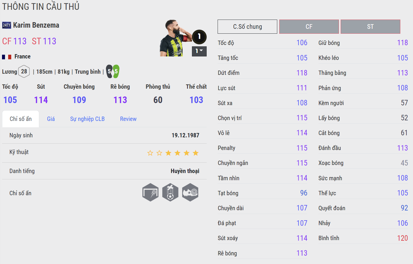 Xuất phát với vai trò hộ công nhưng các HLV đã quá quen thuộc với Benzema cho vài trò tiền vệ tấn công. Đây là vai trò mà hầu hết các mùa thẻ trước đó của Benzema đều thể hiện rất tốt và 24TY cũng không ngoại lệ. Khả năng chuyền bóng thông minh, tỉ lệ kiến tạo tốt, kỹ năng dứt điểm cực kì hiệu quả giúp Benzema thi đấu rất hay ở vai trò tiền vệ công. Ngoài ra khả năng xoay sở xử lý bóng tốt và một thể hình đầm giúp cho việc tranh chấp hay xoay sở ở khu vực trung tuyến của Benzema rất hiệu quả và dễ dàng tạo đột biến.