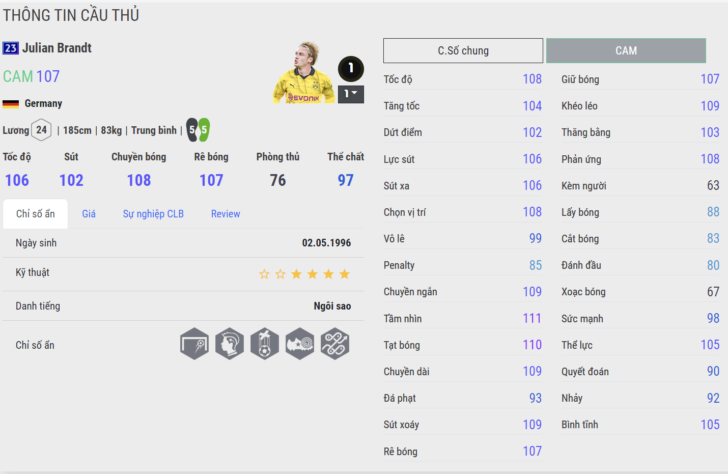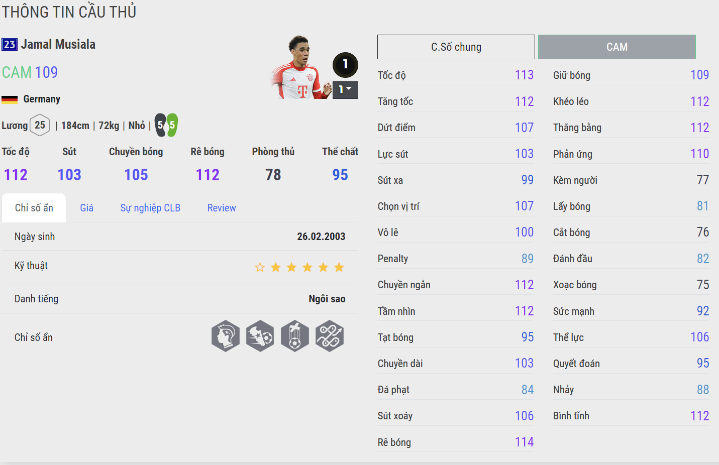 Thi đấu đa năng khi vừa có thể đá như một tiền vệ phòng ngự vừa có thể chơi như một tiền vệ công, Bellingham là một cái tên rất đáng dùng ở mùa thẻ 23UCL. Sở hữu 2 chân 5 sao cùng bộ chỉ số hỗ trợ tấn công lẫn phòng ngự đều ổn. Bellingham vừa có kỹ năng sút tốt, chuyền bóng kiến tạo ổn, khả năng hỗ trợ tấn công lẫn phòng ngự của Bellingham đều tốt. Cầu thủ người Anh được đánh giá là vô cùng toàn diện cho vị trí hàng công.