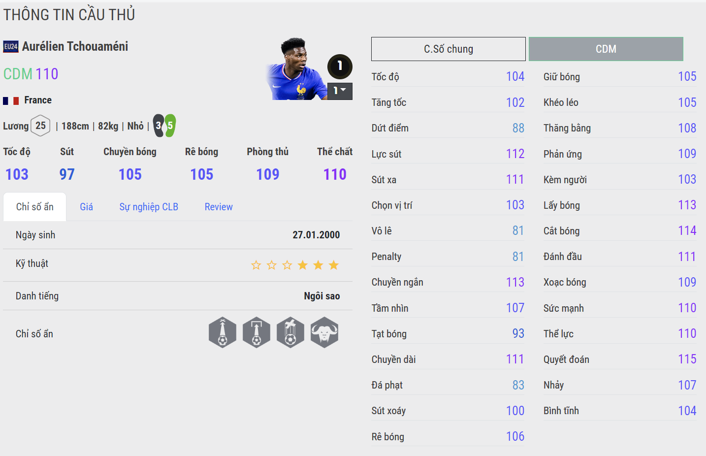 Tchouameni phiên bản EU24 được đánh giá là rất chất lượng. Với thể hình lý tưởng, khả năng sút xa ấn tượng, cùng bộ kỹ năng chuyền bóng, phối hợp và triển khai bóng hiệu quả, anh là lựa chọn sáng giá. Khả năng tì đè, tranh chấp và không chiến của cầu thủ người Pháp cũng rất nổi bật. Sở hữu team color Pháp, một đội có tiềm năng tiến sâu tại Euro, giúp tăng thêm chỉ số cho Tchouameni.