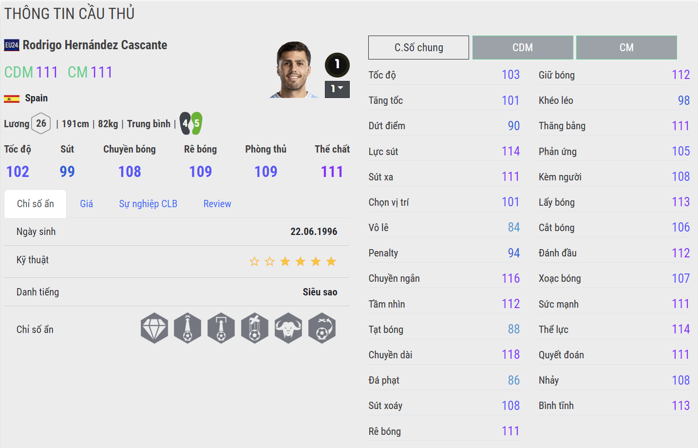 Rodri vẫn được xem là một trong những tiền vệ trung tâm xuất sắc nhất bóng đá hiện đại. Với thể hình cao lớn, kỹ năng sút xa tốt, khả năng chuyền bóng, phối hợp, kiểm soát nhịp độ và thu hồi bóng đều rất hiệu quả. Rodri là mẫu tiền vệ trung tâm toàn diện, mặc dù tốc độ không quá nổi bật. Sở hữu team color Tây Ban Nha, một đội bóng mạnh tại châu Âu, anh có cơ hội tiến xa tại Euro.