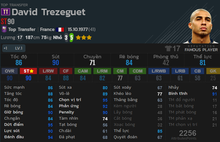Mặc dù Trezeguet ở thời điểm hiện tại chưa có tại sever FIFA Online 4 VN tuy nhiên đây vẫn là một cầu thủ khá chất lượng cho vị trí tiền đạo cắm và lối chơi không chiến. Cùng hi vọng sắp tới cầu thủ này sẽ xuất hiện tại sever VN