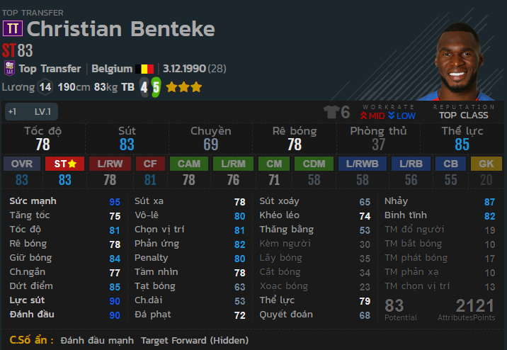 Chiều cao 1m90 cùng cân nặng 83, Benteke có thể chất rất tốt. Với mức giá thấp và lương 14, đây sẽ là một sự lựa chọn chất lượng cho vị trí tiền đạo cắm giá rẻ.