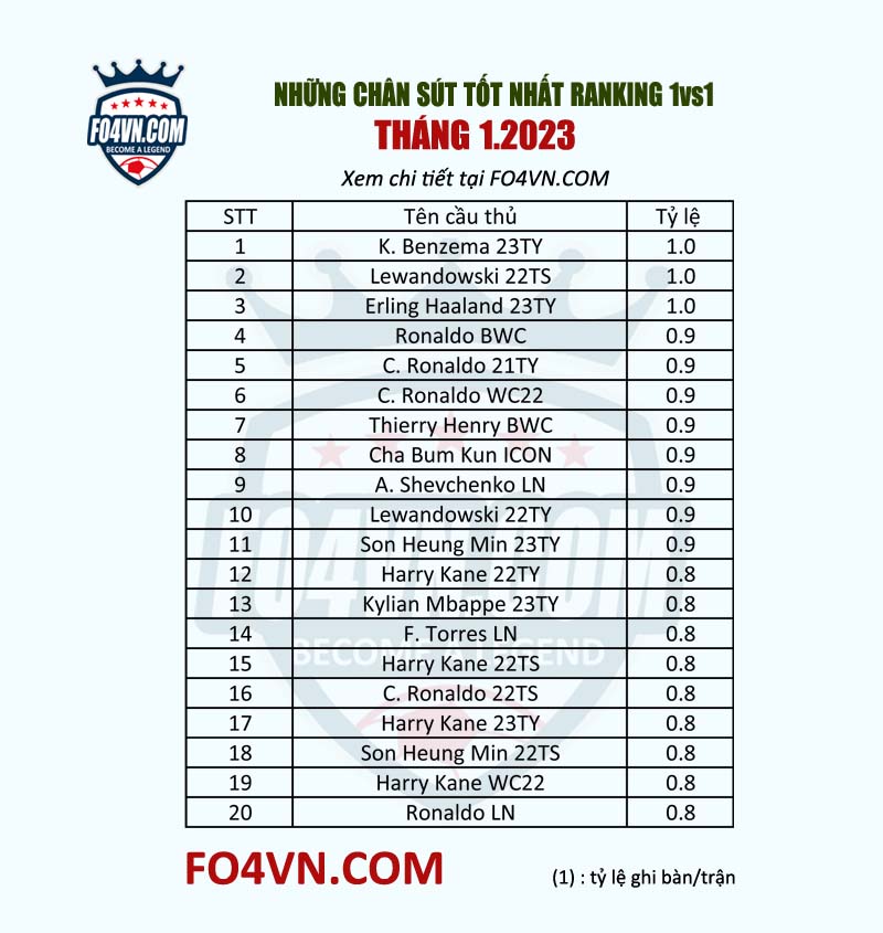 Và tất nhiên khi mà tháng 1 chuẩn bị kết thúc thì chúng ta sẽ cùng nhìn lại những chân sút tốt nhất Fo4 theo thống kê của Nexon trong tháng vừa qua. Thống kê được lấy ở mức rank 3000 và tới thời điểm viết bài nên sẽ có những thay đổi sau đó.