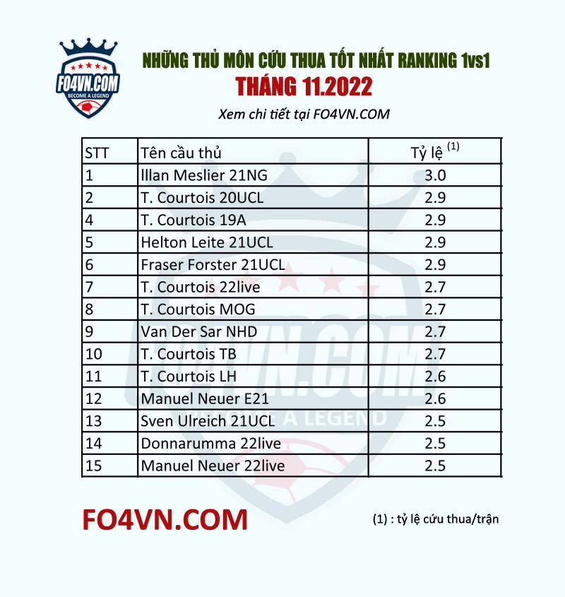 Dưới đây là những thủ môn cứu thua xuất sắc nhất trong tháng 11, với thống kê trong top 3000 từ máy chủ Hàn Quốc do Nexon công bố.
