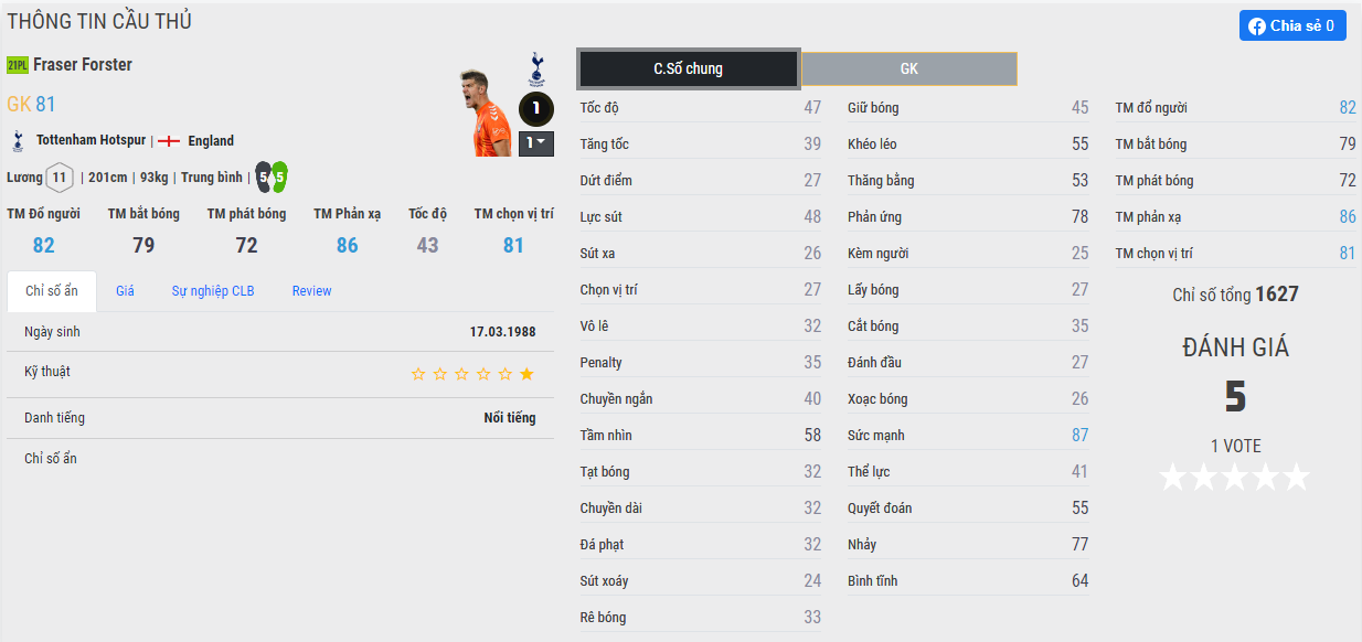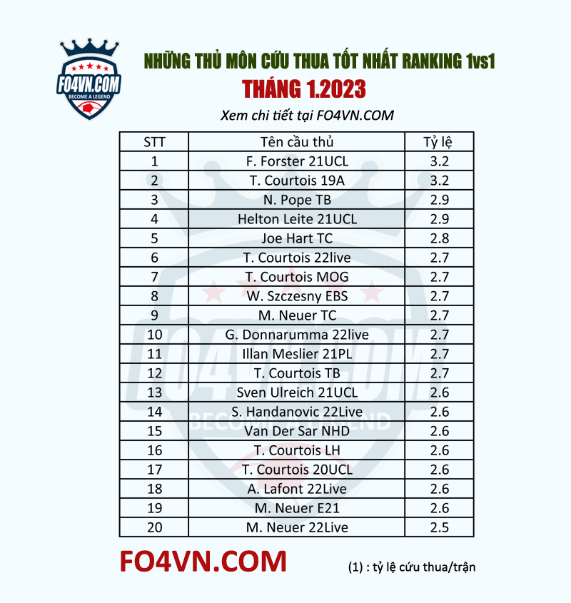 Dẫn đầu danh sách tháng 1 chính là thủ môn người Anh - Forster 21PL , thủ thành này có chiều cao tới 201cm và dù chẳng có chỉ số ẩn nào nhưng anh lại làm được một điều rất tốt là với tới các góc sút khó trong các cú nã đại bác của đối phương.