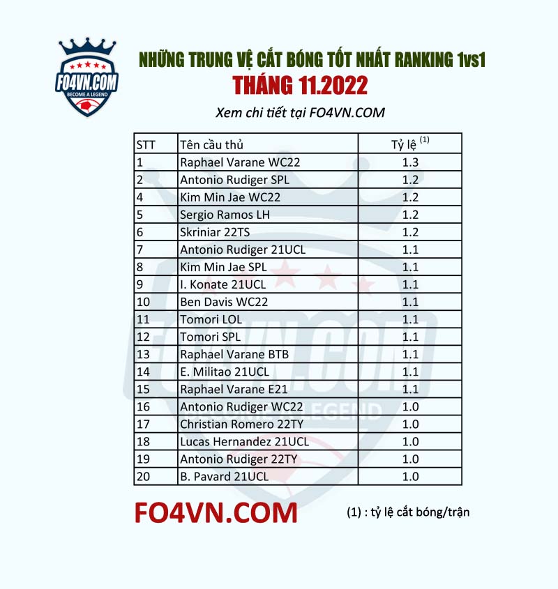 1. Varane WC22 tuy mới ra mắt nhưng đã leo lên ngay top 1 của tháng 11 khi mà trung vệ của MU có màn trình diễn khá tốt ở nửa đầu mùa giải năm nay, một phiên bản có thể coi là nâng cấp của Varane sau một thời gian dài trung vệ này gần như bị thụt lùi so với những cái tên khác.