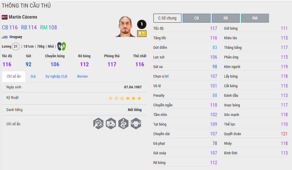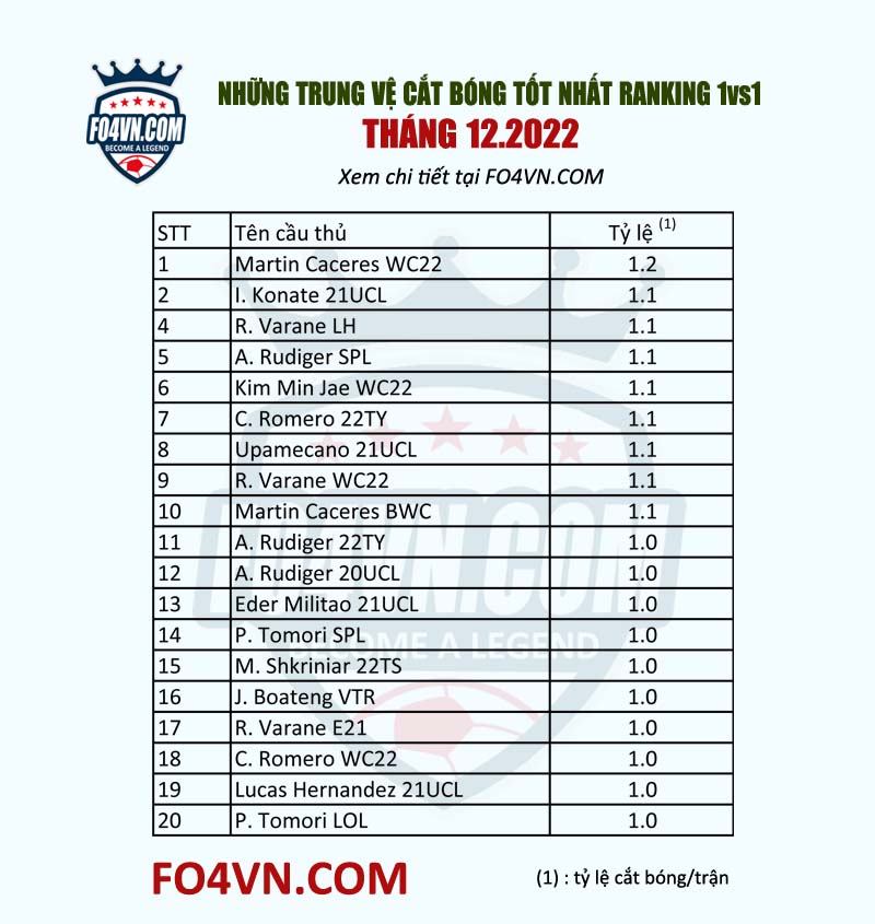 1. Cái tên gây nhiều bất ngờ nhất chính là cầu thủ Martin Caceres với hai mùa giải là WC22 và BWC. Cầu thủ có chiều cao khá khiêm tốn là 1m81 và chỉ số ẩn cũng không hề được đánh giá cao lại chính là cái tên có tỷ lệ cắt bóng cao nhất trong tháng 12. Tuy nhiên có lẽ điều này cũng không có gì khó hiểu bởi ở sever Hàn Quốc thì các game thủ đều sử dụng mức thẻ +8.