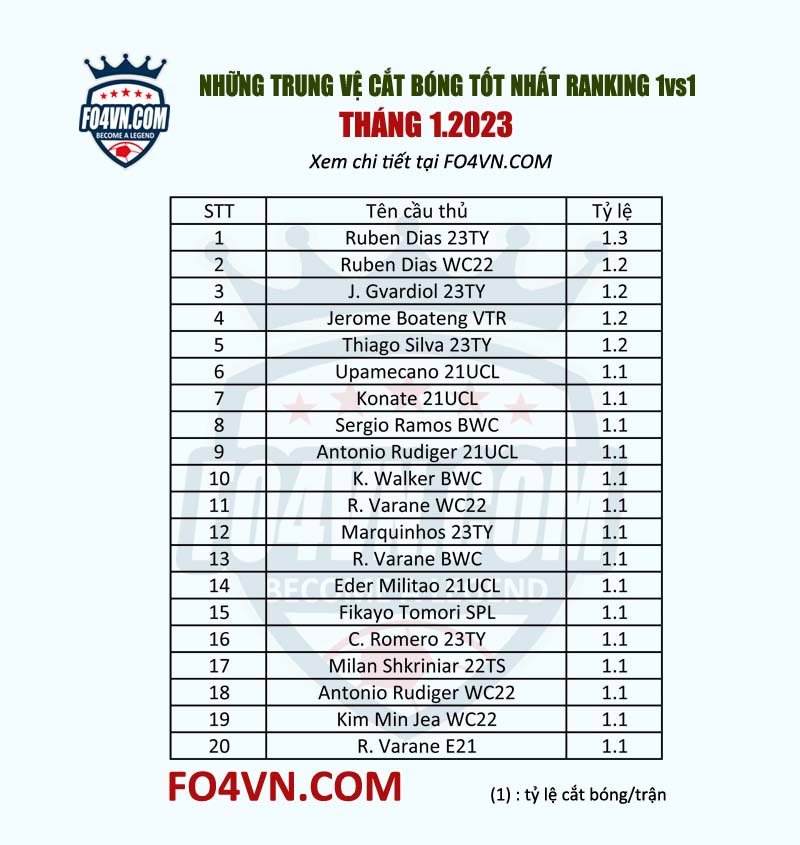 Dưới đây là những trung vệ có tỷ lệ cắt bóng tốt nhất máy chủ của Nexon, thống kê này được tính trong khoảng rank 3000 và có thể thay đổi sau đó.