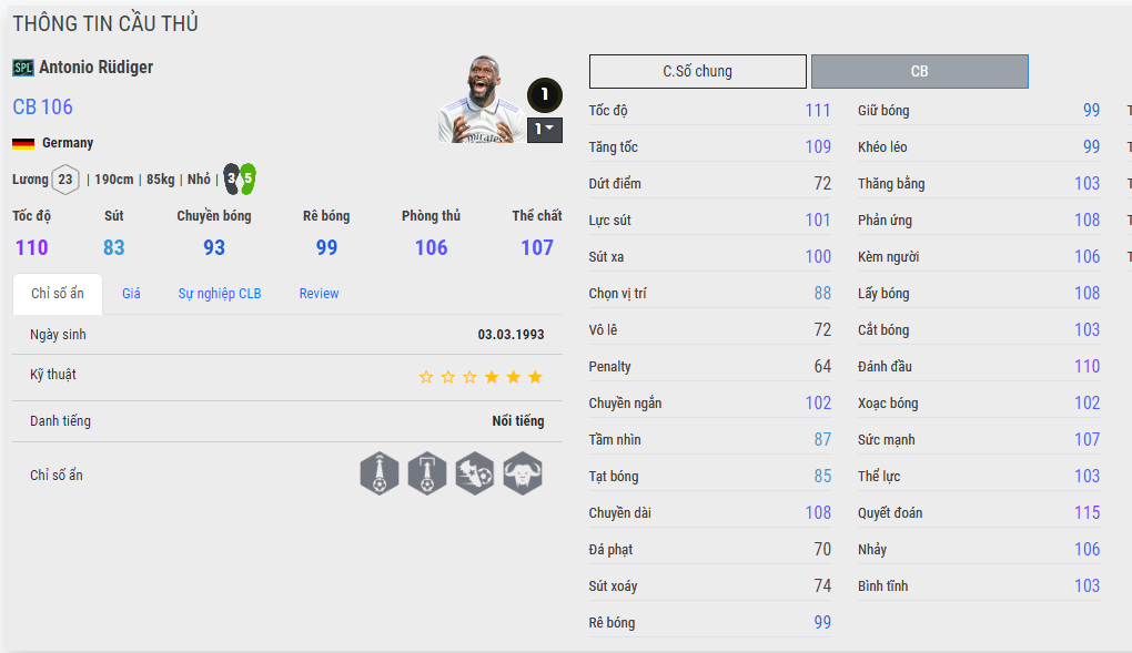 Có thể nói rằng Rudiger là trung vệ toàn diện nhất trong game ở thời điểm hiện tại, cao lớn, tốc độ di chuyển nhanh, không chiến tốt và team color miễn chê. Chưa kể các mùa giải của cầu thủ người Đức có mức lương vô cùng hợp lý với quỹ lương 250 hiện nay, việc có được một ttrung vệ với mức lương 20-23 sẽ tạo điều kiện cho các HLV dễ dàng xây dựng hàng công với các cầu thủ có lương 26-31.