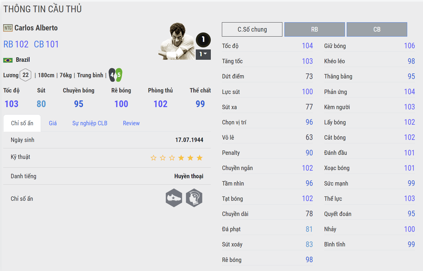Carlos Alberto được đánh giá là một hậu vệ biên chất lượng, thậm chí ông còn thường xuyên được đưa vào thi đấu ở vị trí trung vệ với lợi thế tốc độ và khả năng bắt người rất nhạy. Cầu thủ Brazil được đánh giá rất cao ở mùa NTG dù đã qua rất nhiều gameplay.