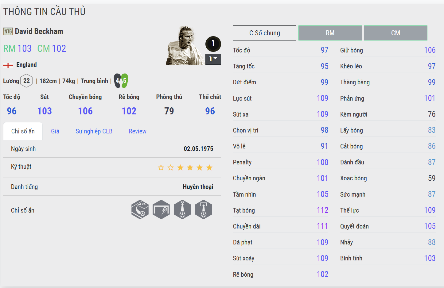 Từng làm mưa làm gió một thời khi là cầu thủ NTG đầu tiên của FC Online. Beckham gần như giữ nguyên đc AI thông minh, lối chơi bóng hiệu quả nơi hành lang cánh khi sở hữu khả năng tạt bóng rất chuẩn xác. Không những thế khả năng xử lý bóng và hỗ trợ tấn công lẫn phòng ngự ở cánh của Beckham là rất tốt.