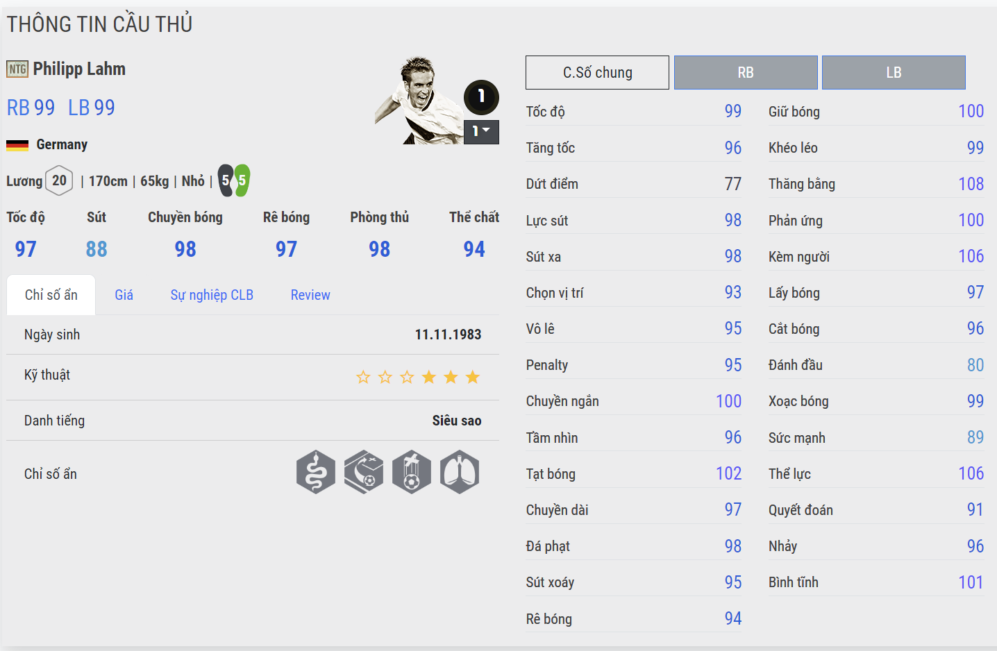 Hậu vệ phải của ĐT Đức và CLB Bayern Munich thời gian vừa qua được đánh giá rất cao cho vị trí hậu vệ phải. Tốc độ, khả năng phòng ngự ổn cùng khả năng hỗ trợ tốt khiến cho Lahm được xem là vị trí đáng dùng ở mức thẻ cộng 8