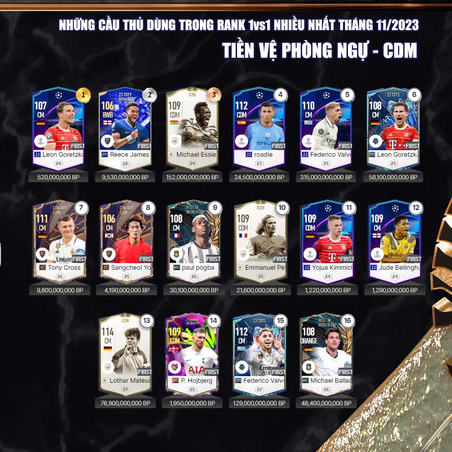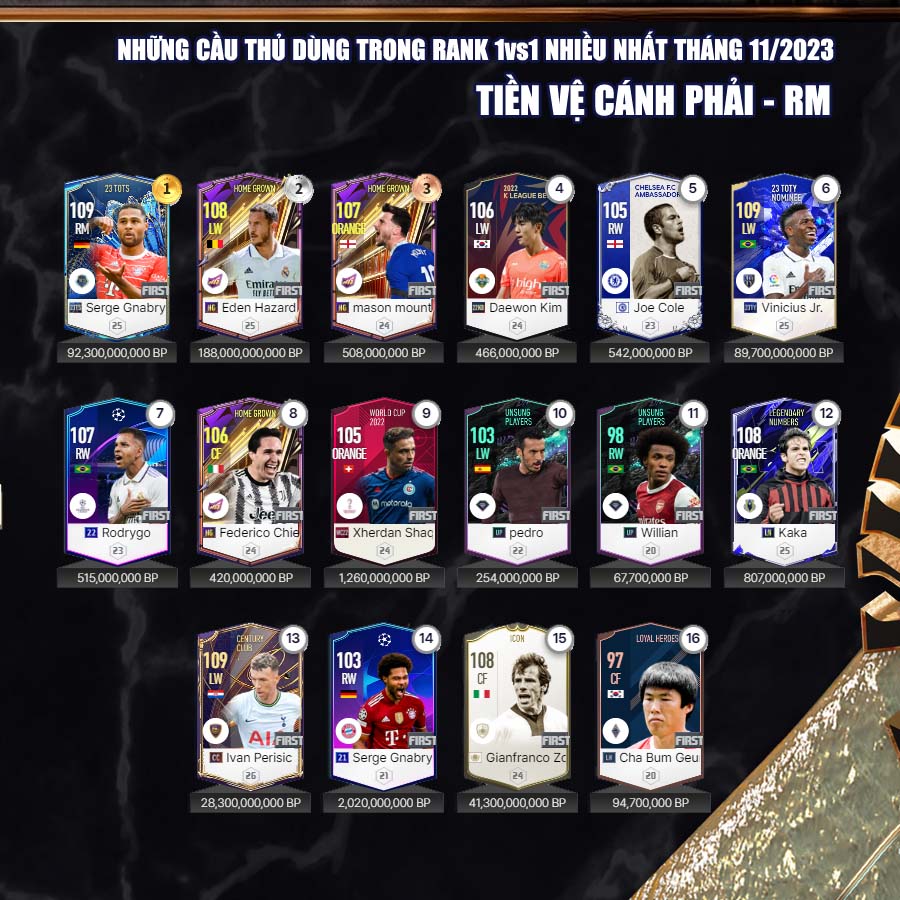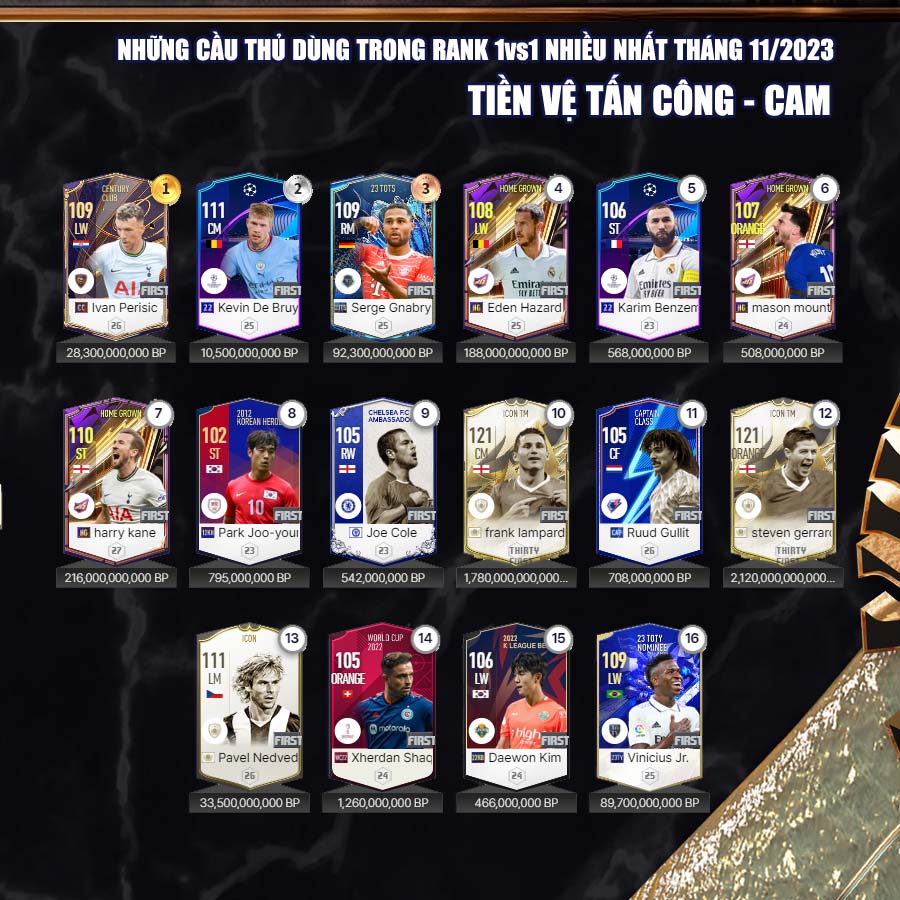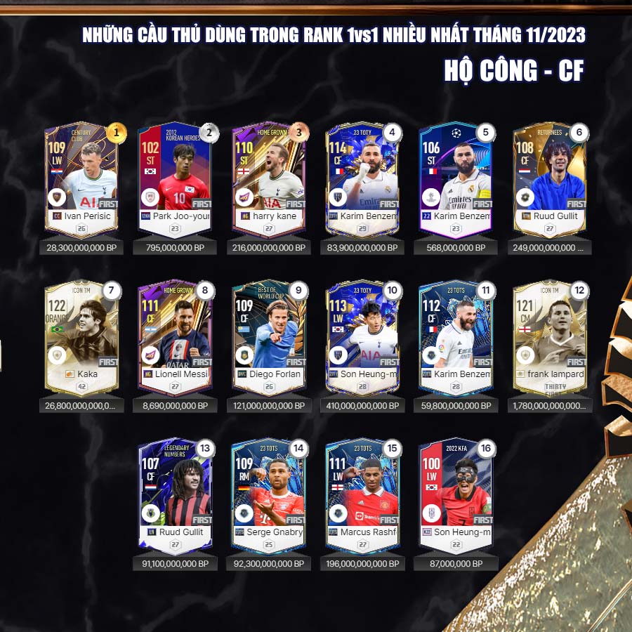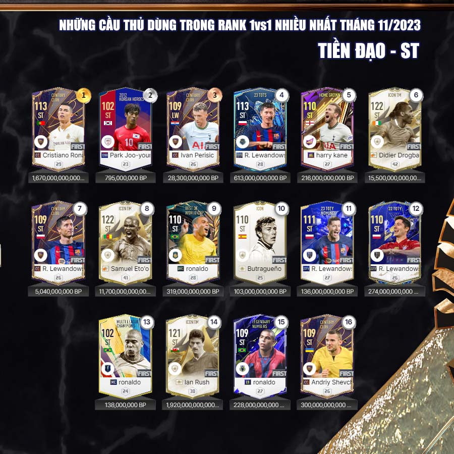 Vị trí tiền đạo được dùng nhiều cũng chứng kiến sự trỗi dậy của Didier Drogba ICON TM, hiện tại thì ở sever Việt Nam chúng ta chưa có thẻ này của Drogba, tuy nhiên nhiều khả năng huyền thoại của Chelsea sẽ được ra mắt vào dịp tết nguyên đán. Ngoài ra chúng ta cũng thấy một cầu thủ rất xưa cũ là Ronaldo MC vẫn được các game thủ tin dùng cho đến tận thời điểm bây giờ, tức là sau 3 năm ngày ra mắt.