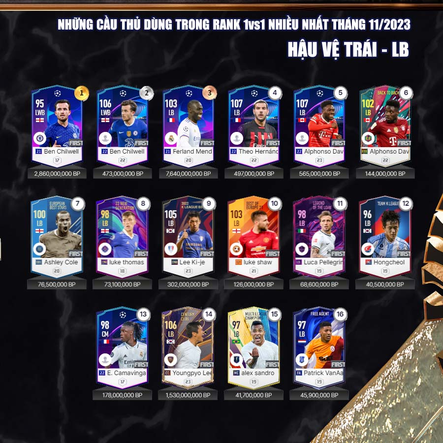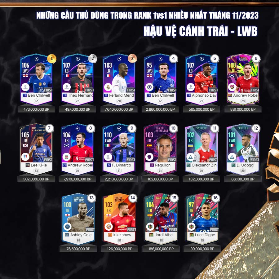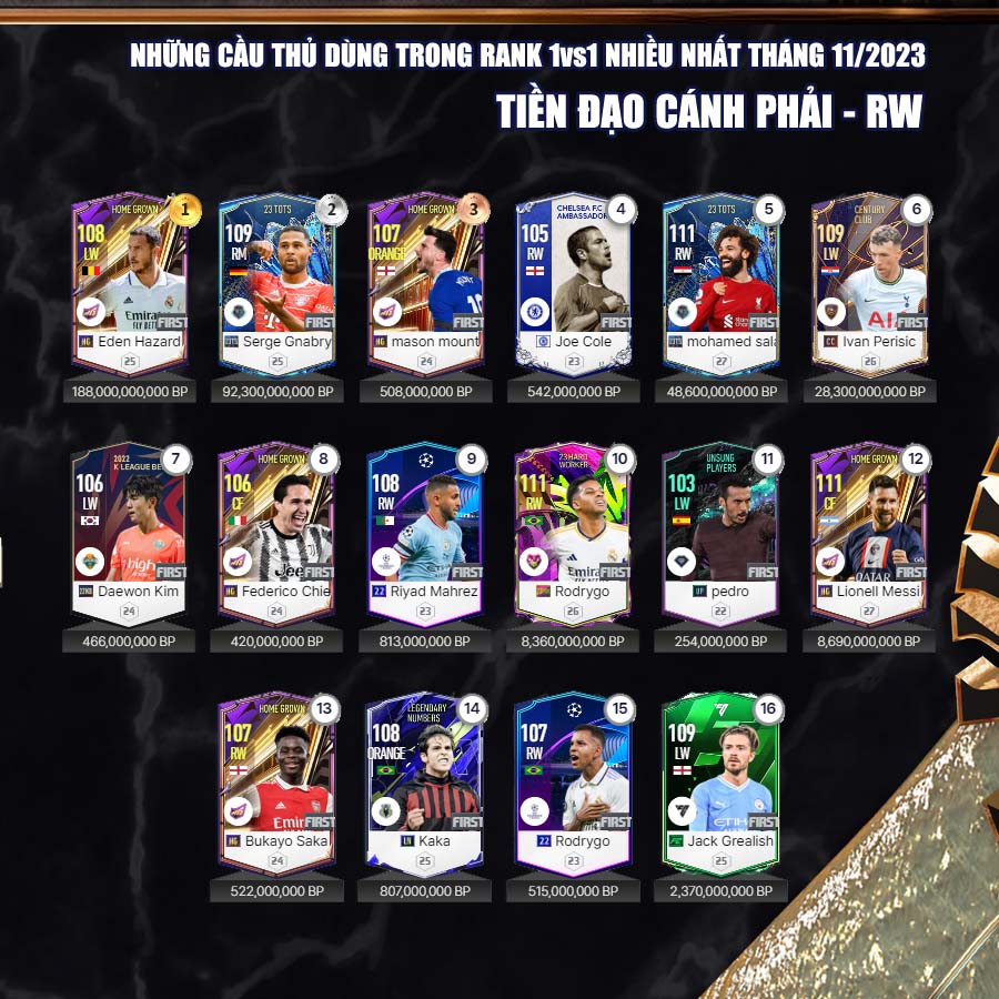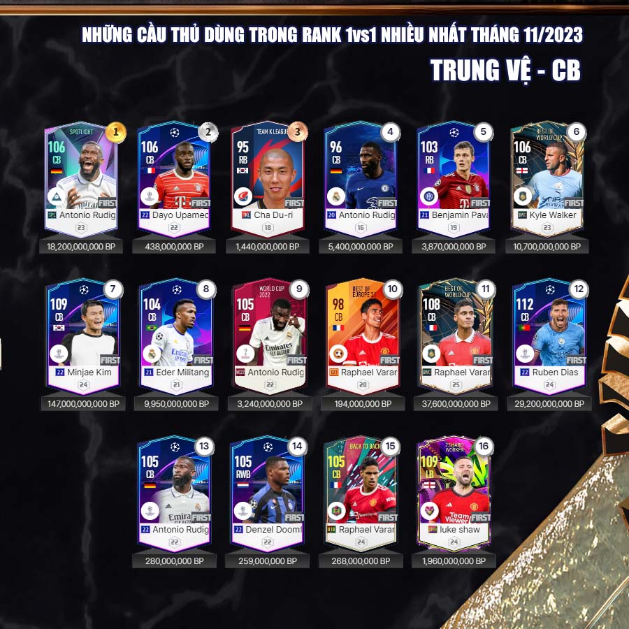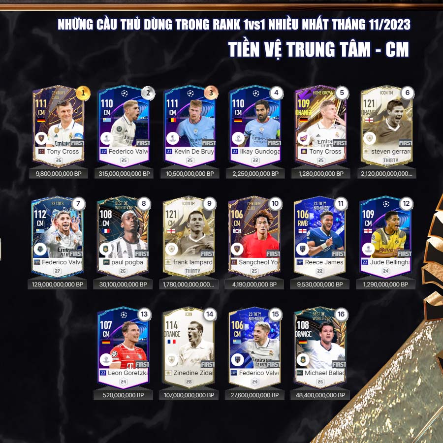 Vị trí tiền đạo được dùng nhiều cũng chứng kiến sự trỗi dậy của Didier Drogba ICON TM, hiện tại thì ở sever Việt Nam chúng ta chưa có thẻ này của Drogba, tuy nhiên nhiều khả năng huyền thoại của Chelsea sẽ được ra mắt vào dịp tết nguyên đán. Ngoài ra chúng ta cũng thấy một cầu thủ rất xưa cũ là Ronaldo MC vẫn được các game thủ tin dùng cho đến tận thời điểm bây giờ, tức là sau 3 năm ngày ra mắt.