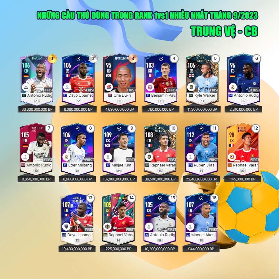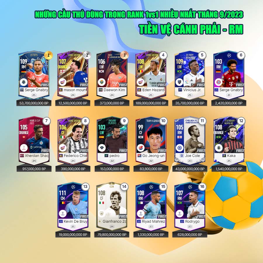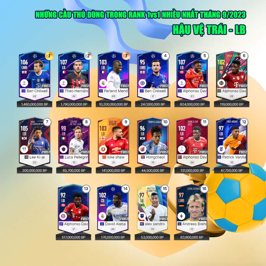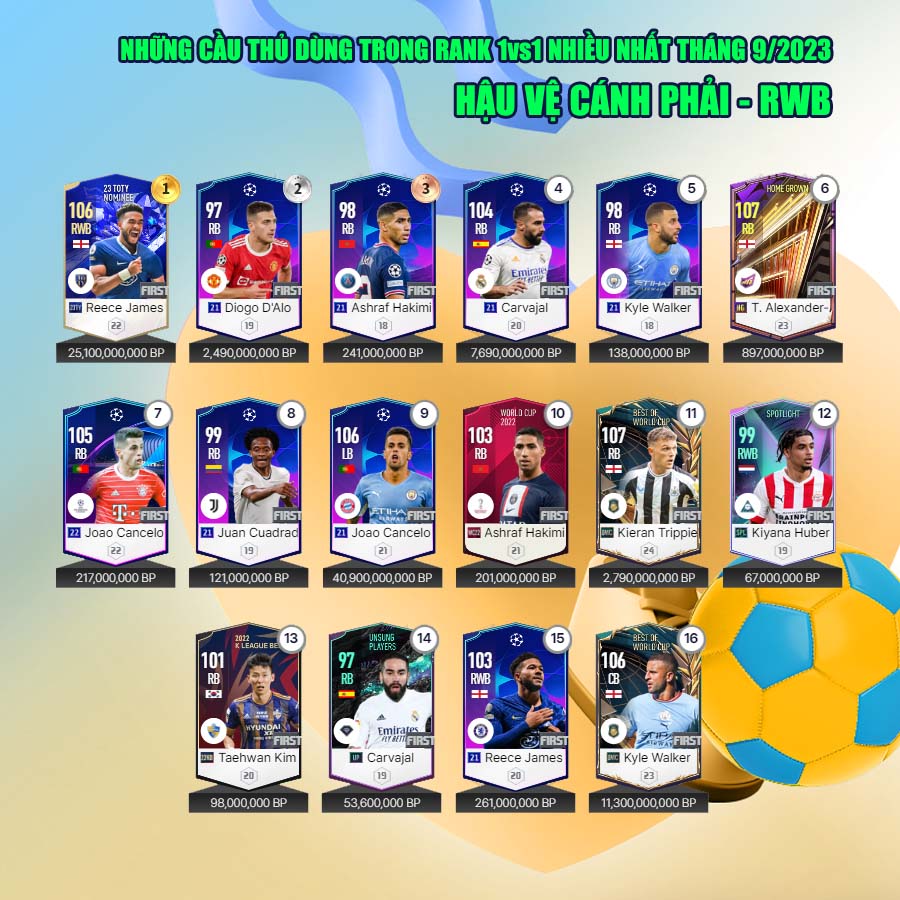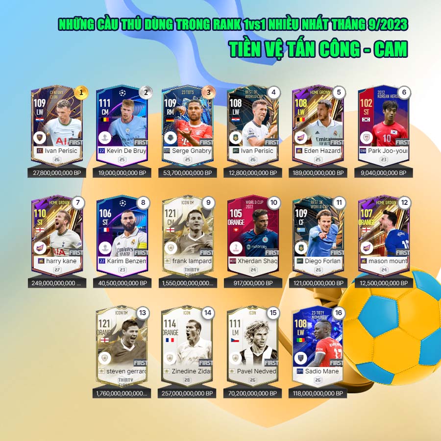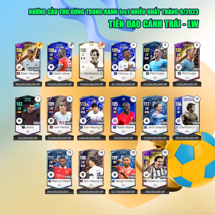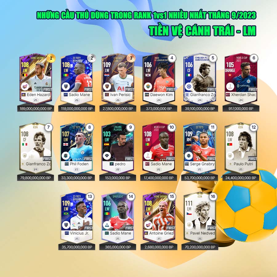 Dưới đây là những cầu thủ được các HLV sử dụng nhiều nhất trong tháng 9 vừa qua, tất nhiên sự xuất hiện của hai mùa giải 23HW và FC Ambassador là chưa nhiều.
