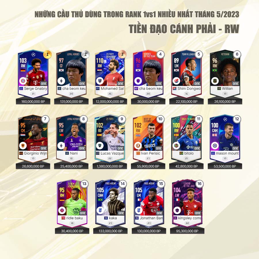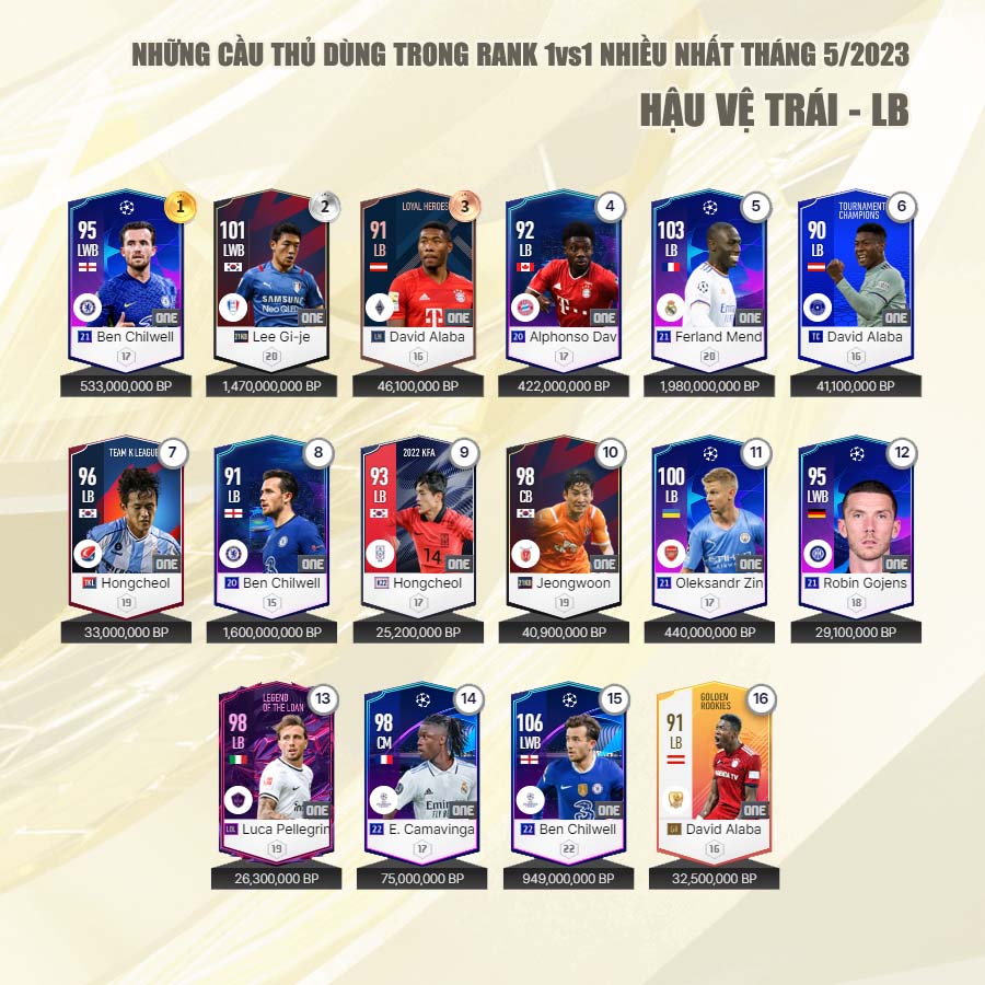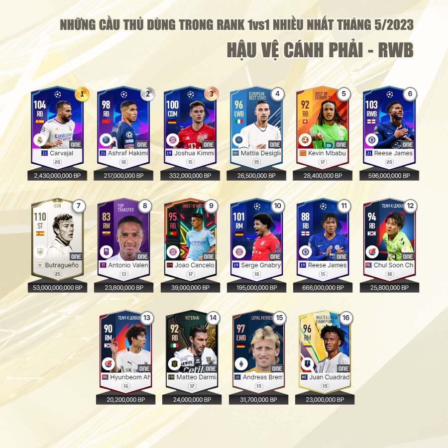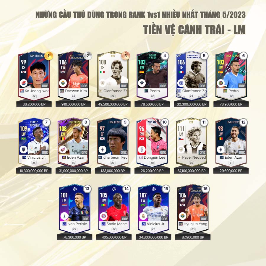 Các hậu vệ cánh có mức lương 15-16 bỗng dưng hot trở lại để gánh lương cho các cầu thủ tấn công với mức ovr cực cao của ICON TM. Đáng chú ý các bạn có thể thấy là hai huyền thoại Zola và Butragueno cũng được các game thủ Hàn kéo ra đá LWB, RWB. Việc tận dụng các cầu thủ có khả năng tấn công tốt vượt trội đưa về vị trí này sau đó gắn cho skill xâm nhập để tạo đột biến trong các sơ đồ 5 hậu vệ không phải là mới. Nhưng có lẽ đây là lần đầu thấy hai tiền đạo được kéo về như vậy.