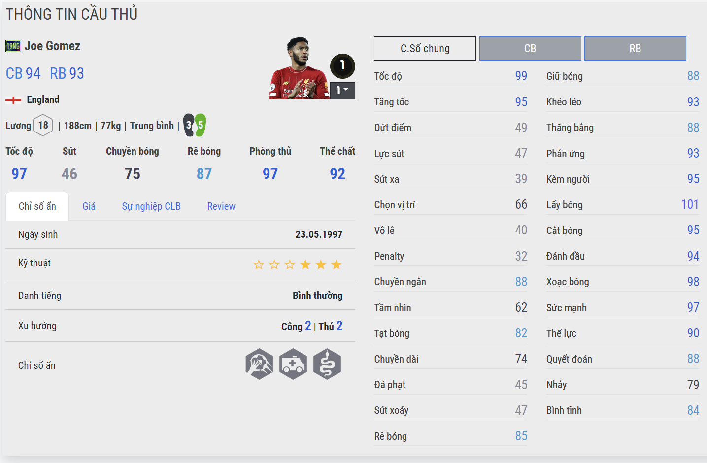 Mùa thẻ 19NG của Gomez là một mùa thẻ rất đáng dùng trong FC Online, đây là mùa thẻ mà Gomez xuất hiện trong FC Online với vai trò thiên về hậu vệ cánh hơn. Điều này giúp cầu thủ của Liverpool có thể chơi đa năng hơn trong hàng phòng ngự. Tốc độ tốt, thể hình to cao và không ngại tranh chấp lẫn đua tốc với đối phương. Với mức thẻ cộng 8, Gomez rất đáng dùng cho mùa 19NG